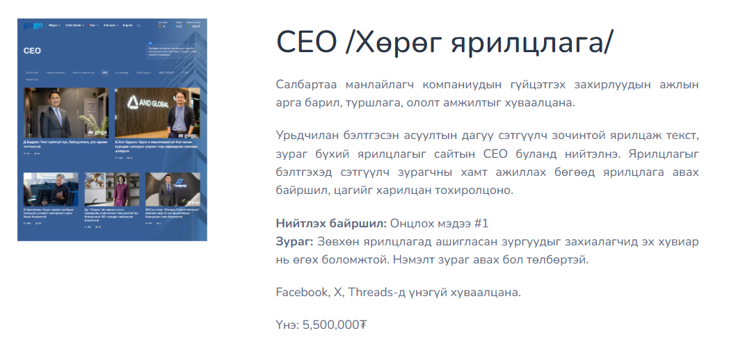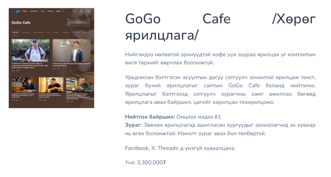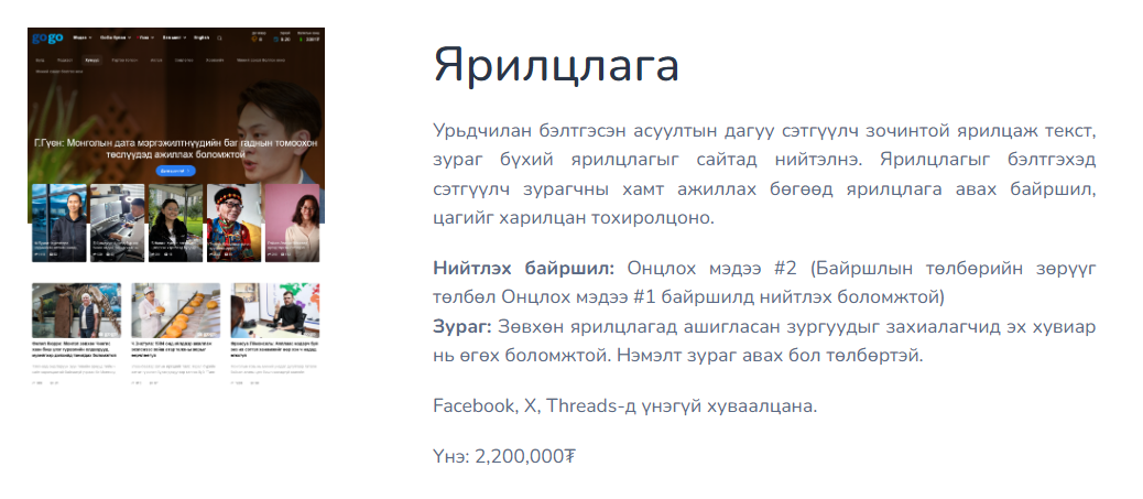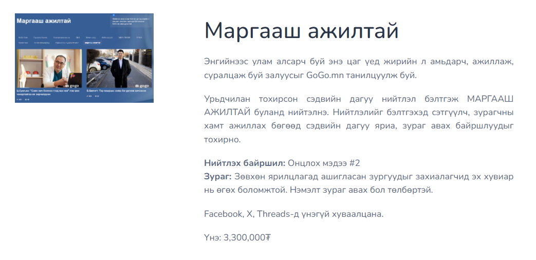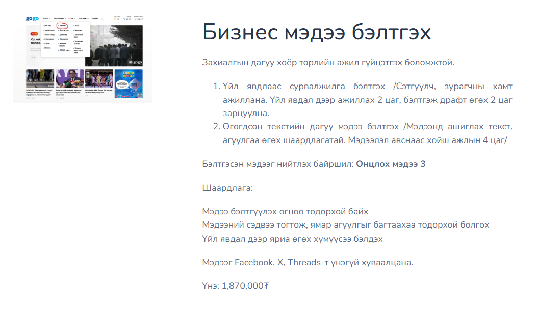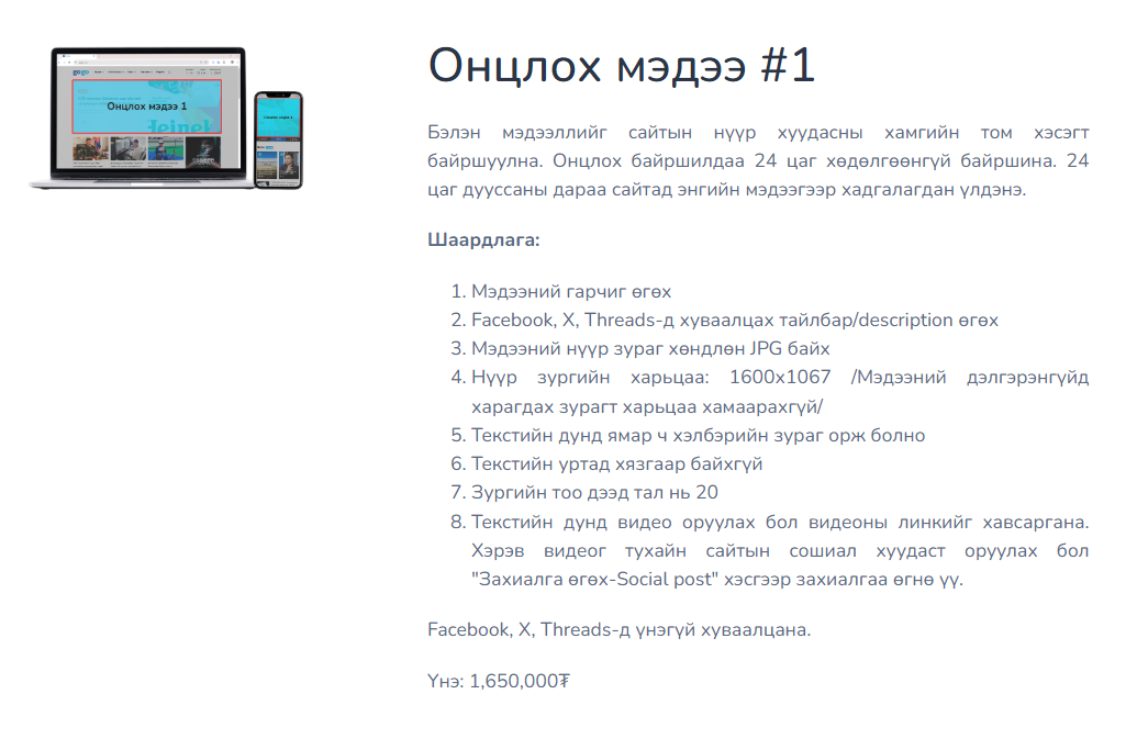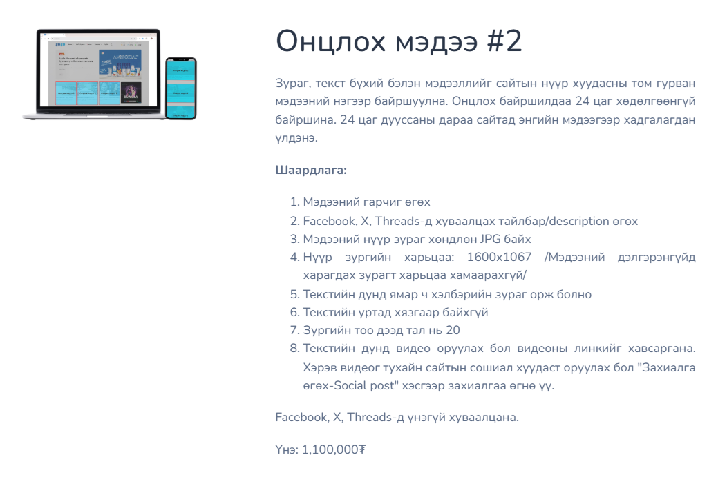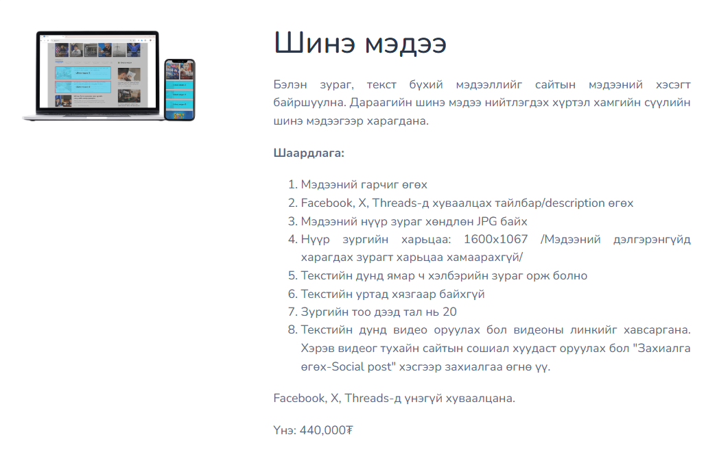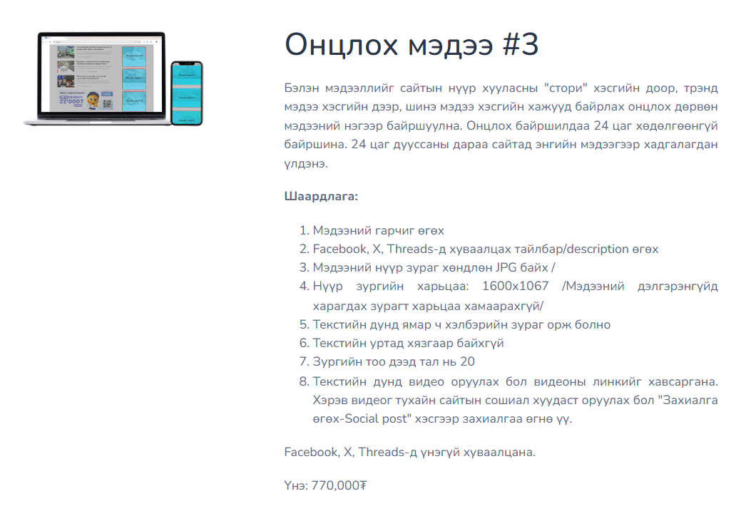 - Мэдээний текст (Мэдээний гарчгийг тодорхой бичих) зураг (Мэдээний нүүр зураг хэвтээ байх, бусад зураг өндөр чанартай байх), видео (Youtube, Facebook, Twitter зэрэг аль нэг платформ дээр байршуулж линкийг хавсаргах)
