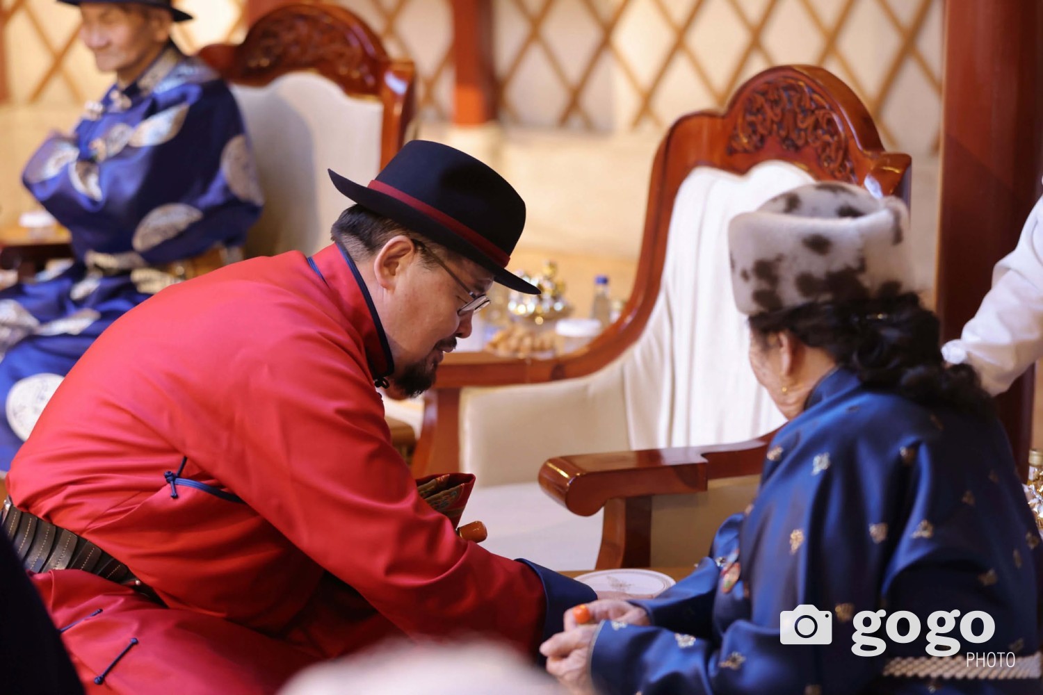 Ерөнхийлөгч У.Хүрэлсүх, Улсын Их Хурлын дарга Н.Учрал, Ерөнхий сайд Г.Занданшатар нар ахмадын төлөөлөлтэй золгож, хүндэтгэл үзүүлж байна.