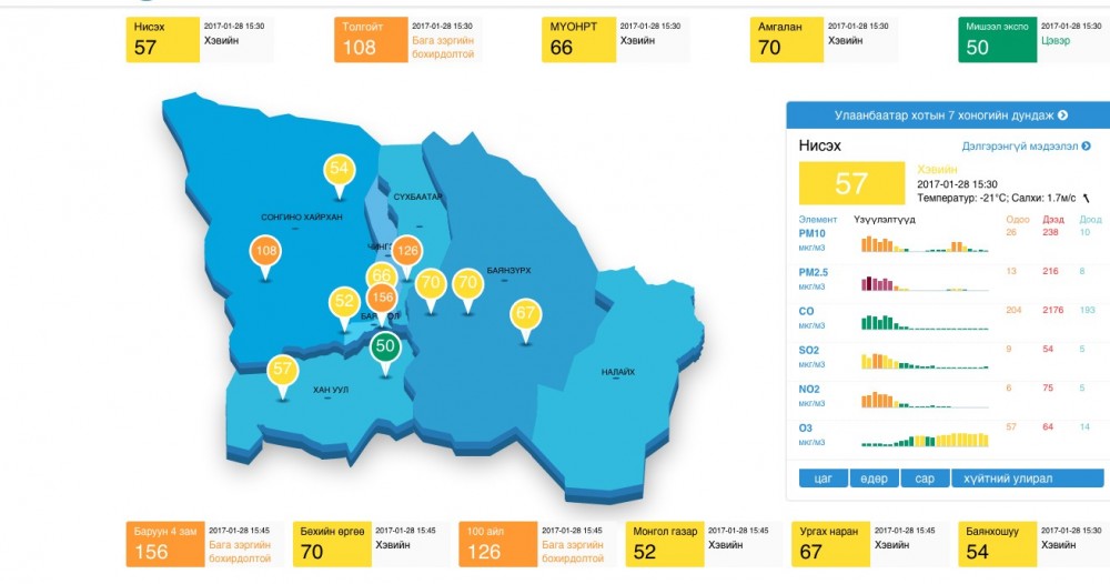 Харин өнөөдөр нийслэлийн олон дүүргийн агаарын чанар бага бохирдолтой болон хэвийн байна.