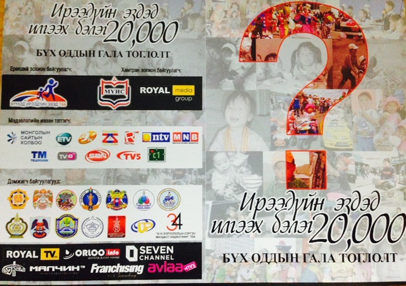 “Ирээдүйн эздэд илгээх бэлэг 20000” бүх оддын гала тоглолт энэ сарын 11-нээс 17-ны хооронд болно. Монгол Улсын Филармоны уран бүтээлчид, үндэсний язгуур урлагийн “Алтай”, “Жонон”, Увертура, хип хоп урсгалын төлөөлөгчид, амьд хөгжмийн хамтлагууд нэгдэн ирээдүйн эзэд, хүүхэд багачуудад бага боловч баяр бэлэглэх хандивын тоглолтод нэгдээд байна.