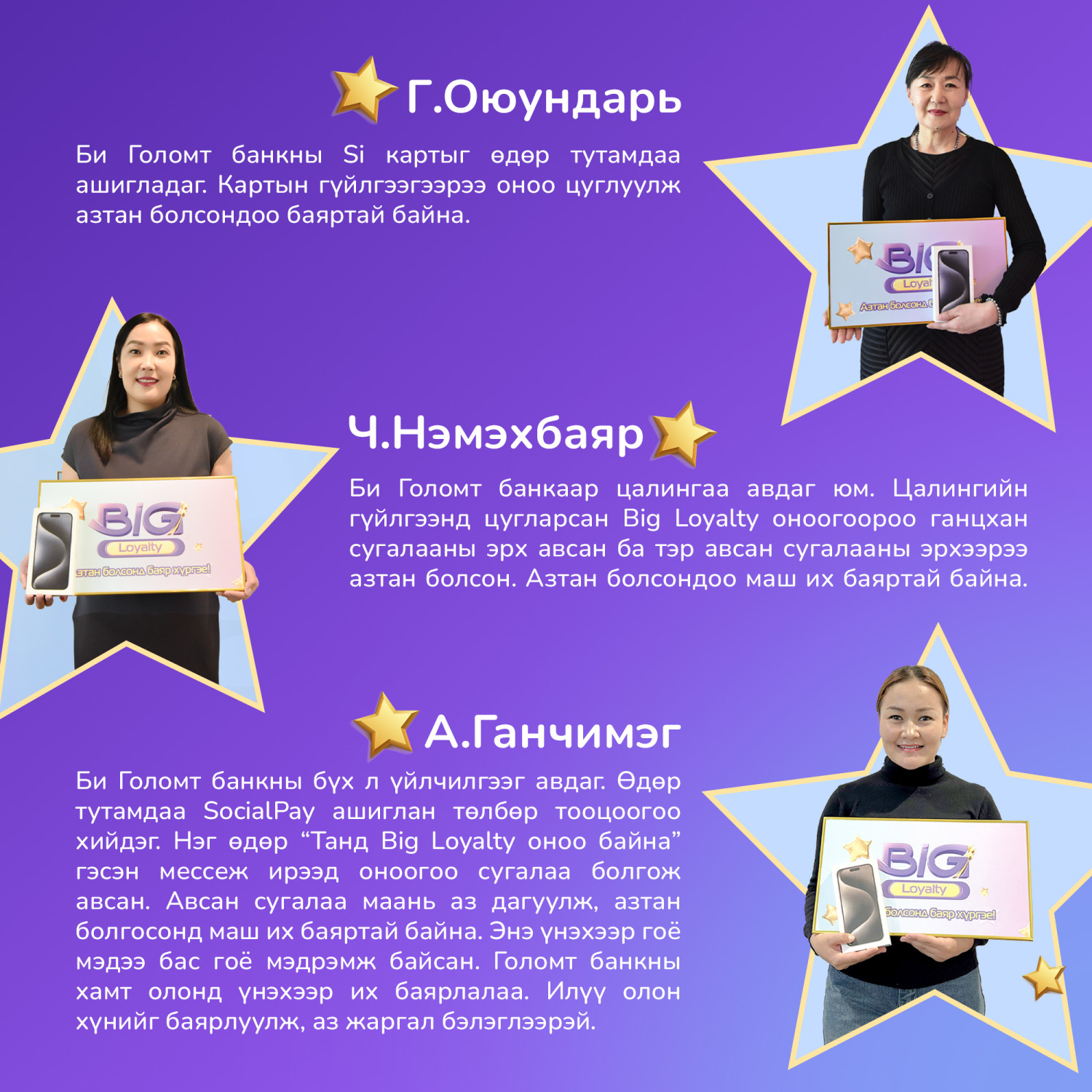 Хөтөлбөрийн хүрээнд дахин 2 азтаныг тодруулж, гар утас бэлэглэх тул хэрэв та Big Loyalty оноотой бол SocialPay болон loyalty.golomtbank.com вэбсайтаар нэвтрэн сугалааны эрхээ идэвхжүүлээрэй.