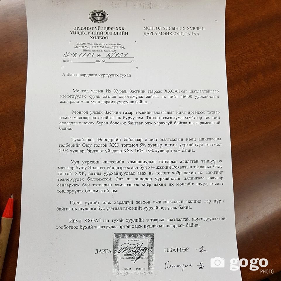 Иймд “Уул уурхайн чиглэлийн компаниудын татварыг адилтган тэнцүүлэх маягаар буюу Эрдэнэт үйлдвэрээс авч буй хэмжээний Рояалтын татварыг Оюу толгой ХХК, Алтны уурхайнуудаас авах нь төсөвт хоёр дахин их мөнгийг төвлөрүүлэх боломжтой” гэдийг Эрдэнэт үйлдвэрийн ХХК-ийн Үйлдвэрчний эвлэлийн холбооноос мэдэгдлээ.