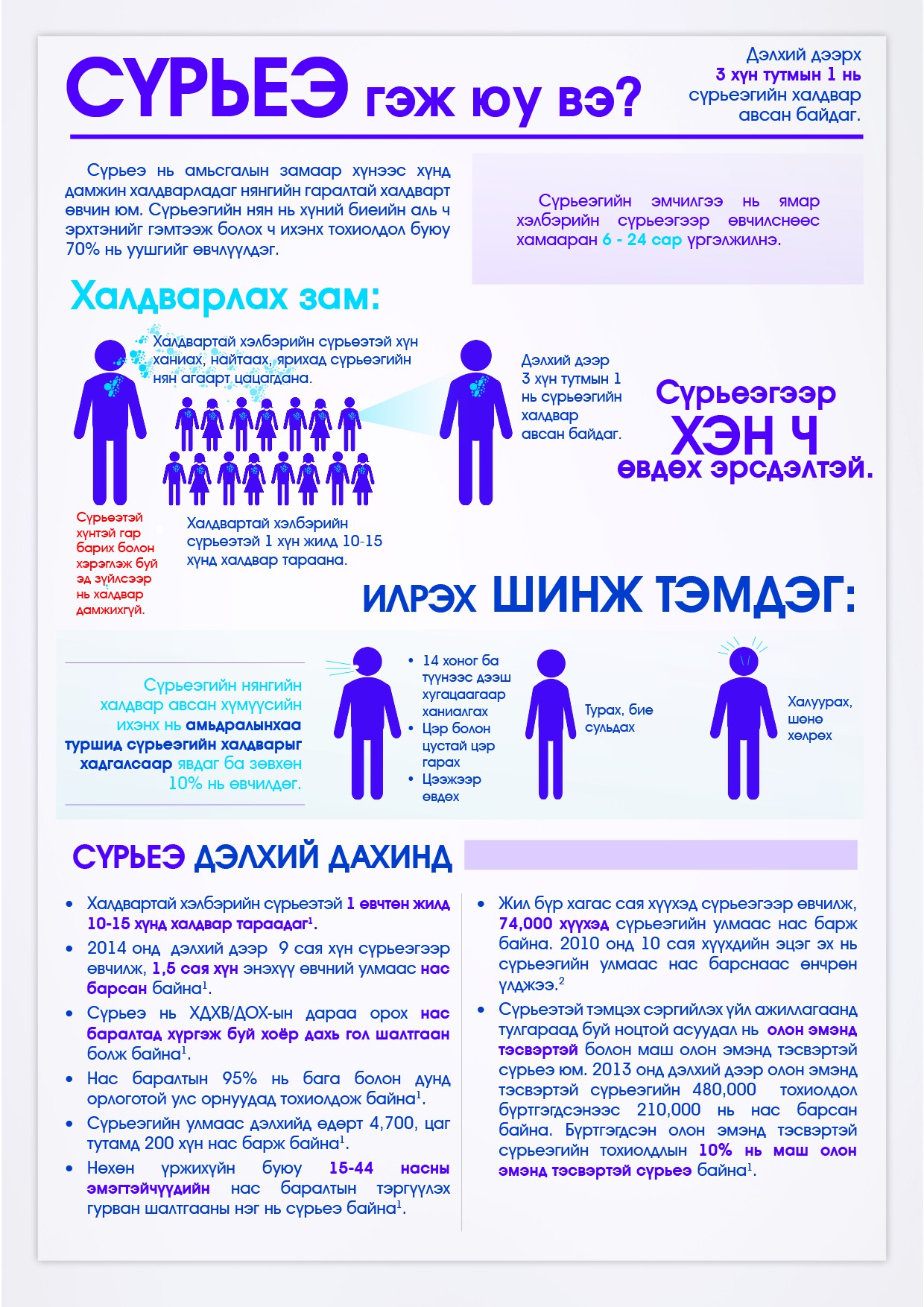 Манай улсад жилд дунджаар 4000 гаруй сүрьеэгийн шинэ тохиолдол бүртгэгдэж байна. Үүний арван хувь нь хүүхдэд тохиолдож буй бөгөөд нийт өвчлөгсөдийн 70 хувь нь хөдөлмөрийн буюу 16-45 насныхан байгаа юм.