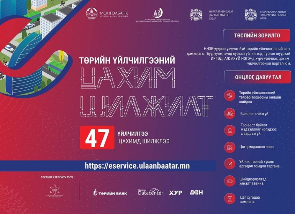 Нийслэлийн цахим үйлчилгээний Еservice порталаар үзүүлэх 5 байгууллагын 47 төрлийн дараах үйлчилгээнүүд нэвтрээд байна. Үүнд: