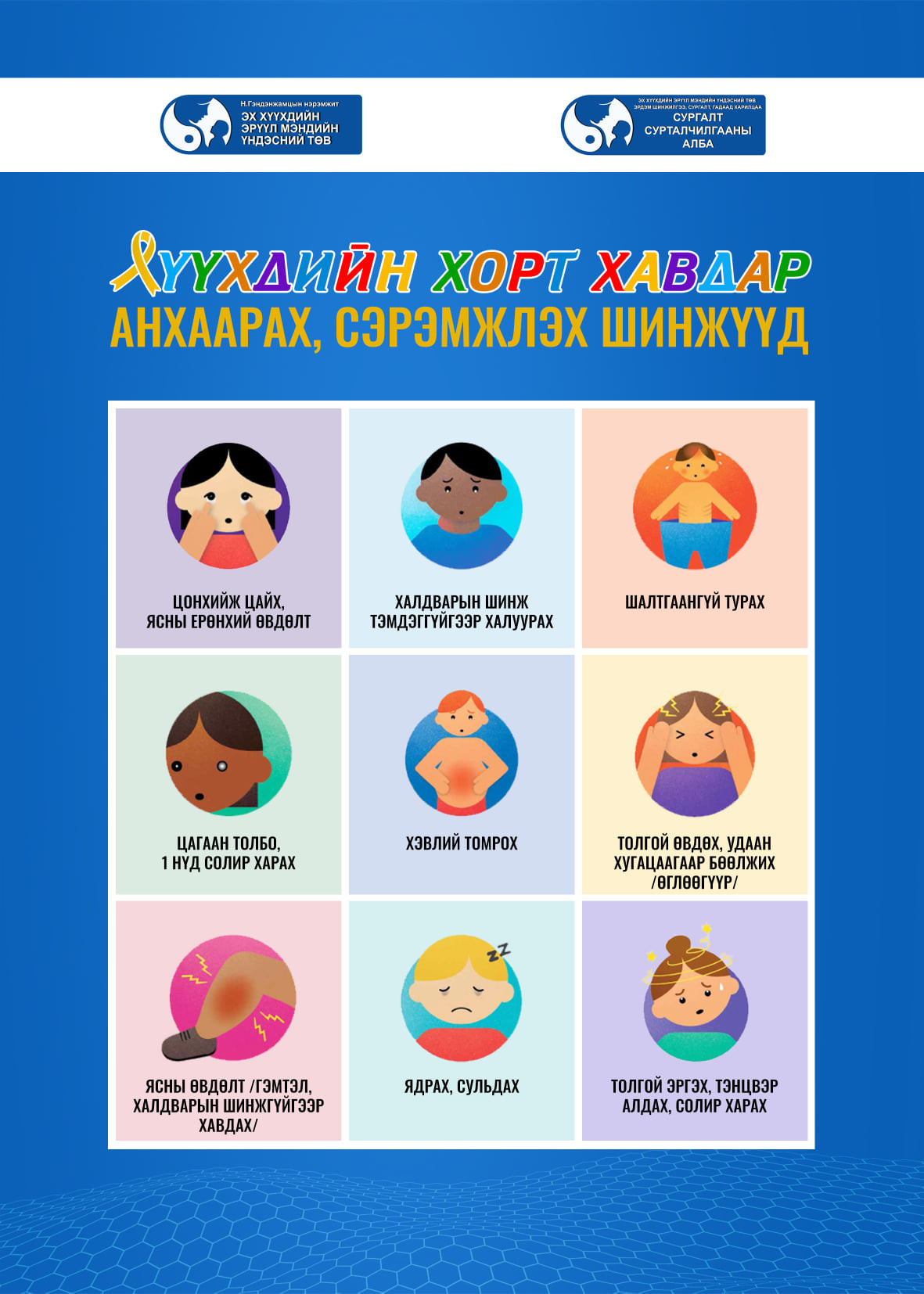 Хүүхдийн хорт хавдрын 95% нь шалтгаан тодорхойгүй, 40% нь хожуу шатандаа оношлогдож байна. Тиймээс эрт оношлох нь хамгийн чухал. Иймд хүн бүр хүүхдийн хорт хавдрын анхаарах шинж тэмдгүүдийн талаарх ойлголт, мэдээллээ нэмэгдүүлэхийг ЭХЭМҮТ-өөс зөвлөлөө.