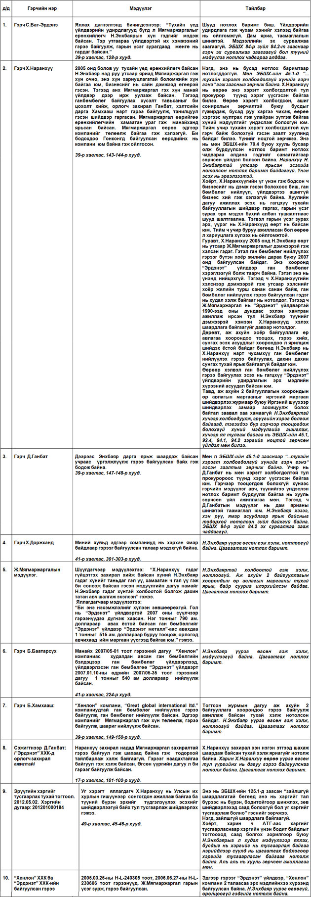 Тийм учир нийт иргэддээ хандаж байгаа бөгөөд Н.Энхбаярыг улс төрийн зорилгоор хэлмэгдүүлж, мөн түүнийг дагалдуулж ямар ч гэм буруугүй Д.Чулуунбаатар, Д.Дуламсүрэн, Ж.Мягмаржаргал нарыг хоморголон хэлмэгдүүлж буй бусармаг үйл ажиллагааг олон түмэндээ илчлэхийн үүднээс нотлох баримтуудыг хүснэгтлэн гаргаж танилцуулж байна. Ингэх нь үнэнийг тогтоох, шударга ёсыг сэргээхэд зайлшгүй хэрэг болно хэмээн итгэж байна.