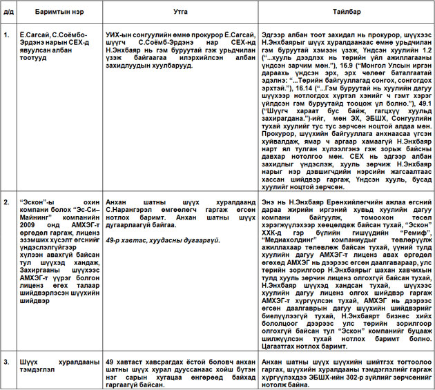 Дээр хүснэгтлэн харуулсан баримтуудаар Н.Энхбаяр нь дээрх асуудлуудтай ямар ч холбоогүй, тэдгээрийн талаар тусад нь болон хамтад нь хэзээ нэгэн цагт ямар ч шийдвэр гаргаж байгаагүй, ямар ч хууль зөрчөөгүй, дээрх асуудлуудаар ямар нэгэн байгууллага, хувь хүн хохироогүй гэдэг нь хөдөлбөргүй нотлогдож байна.