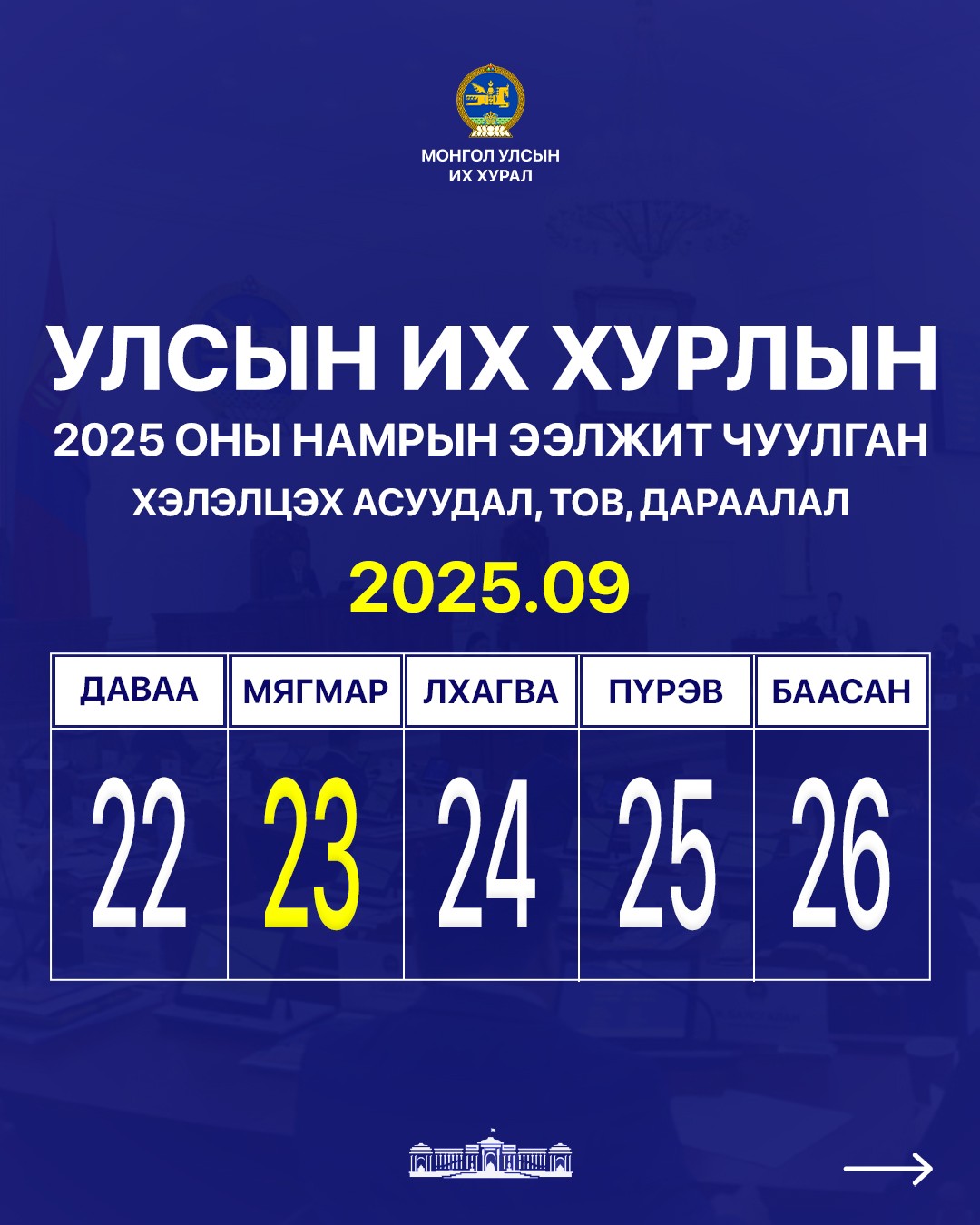 Өнөөдөр /09.23/ УИХ-ын чуулган 14:00 цагаас хуралдаж дараах асуудлуудыг хэлэлцэнэ.