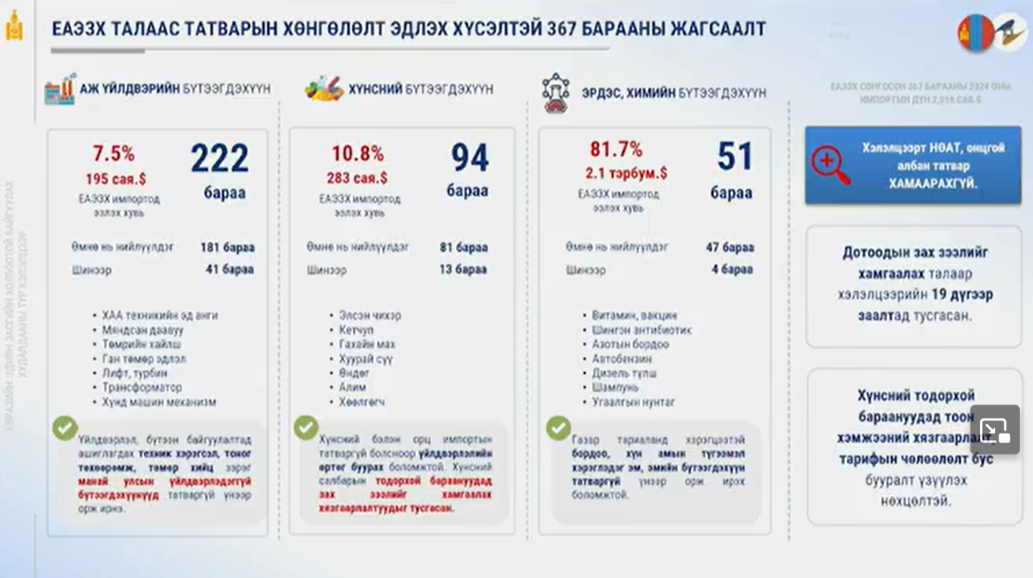 Евроазийн талаас аж үйлдвэрийн бараа бүтээгдэхүүн импортоор орж ирнэ. Монголчууд жилд 500 сая ширхэг өндөг хэрэглэдэг бөгөөд үүний 400 саяыг дотоодоос хангах боломж бүрдээд байна. Үлдсэн 90 сая өндгийг ЕАЭЗХ-той хамтарснаар тарифын хөнгөлөлттэй оруулж ирнэ. Улаанбуудайн хувьд 50 мянган тонн бүтээгдэхүүнийг хөнгөлөлттэй нөхцөлөөр авах боломжтой.