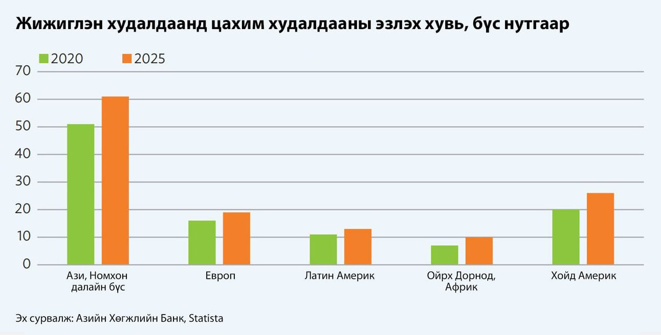 Цар тахлын хямралаас үүдсэн хэрэглэгчийн зан төлөвийн өөрчлөлт бүр мөсөн хадгалагдан үлдэж, ирээдүйд эрэлт өсөхөд түлхэц болсноор 2025 он гэхэд цахим худалдааны зах зээл дэлхийн дотоодын нийт бүтээгдэхүүний 6.4 хувийг эзэлдэг болох төлөвтэй. Дэлхийн хамгийн том цахим худалдааны зах зээл болох Ази, Номхон далайн бүс энэхүү өсөлтөд ямар үүрэгтэй оролцохыг Азийн Хөгжлийн банк өнгөрсөн сард гаргасан “Ази, Номхон далайн бүсийн цахим худалдааны хувьсал” тайландаа дэлгэрэнгүй дүгнэжээ.