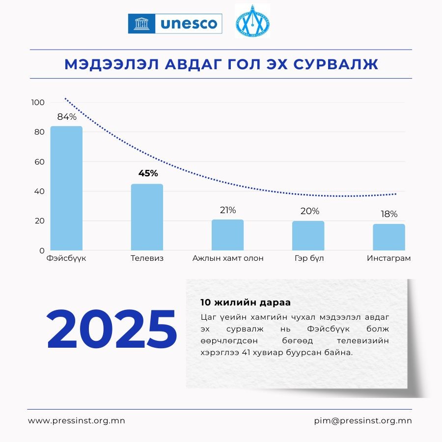 Энэхүү ажлын хүрээнд хэрэгжүүлж дуусаад буй Хэвлэл мэдээллийн хэрэглэгчдийн судалгааны зарим үр дүнгээс танилцуулж байна. Сүүлийн 10 жилийн хугацаанд иргэдийн цаг үеийн мэдээлэл авдаг эх сурвалжид ихээхэн өөрчлөлт гарчээ. 2015 онд цаг үеийн мэдээлэл авдаг хамгийн гол эх сурвалж нь телевиз байсан бол 2025 онд Фэйсбүүк болж өөрчлөгджээ.