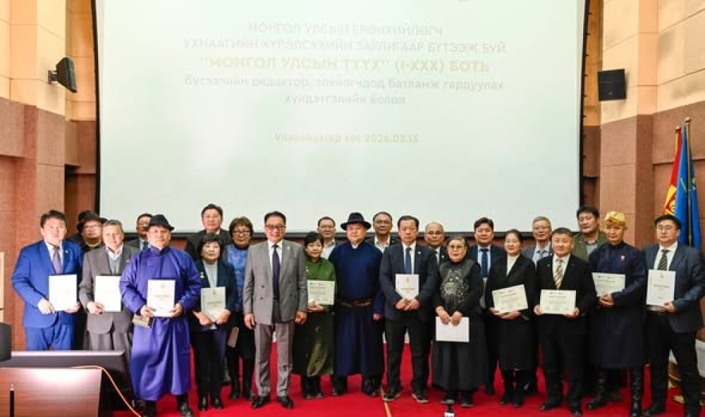 ”Монгол Улсын түүх” (30 боть) бүтээлийн редактор, зохиогчоор сонгогдсон эрдэмтэн судлаачдад батламж гардуулах ёслол ШУА-ийн Тэргүүлэгчдийн газрын Хурлын танхимд (2026.02.13) болж, бүтээлийг туурвих түүхч эрдэмтэд оролцлоо.