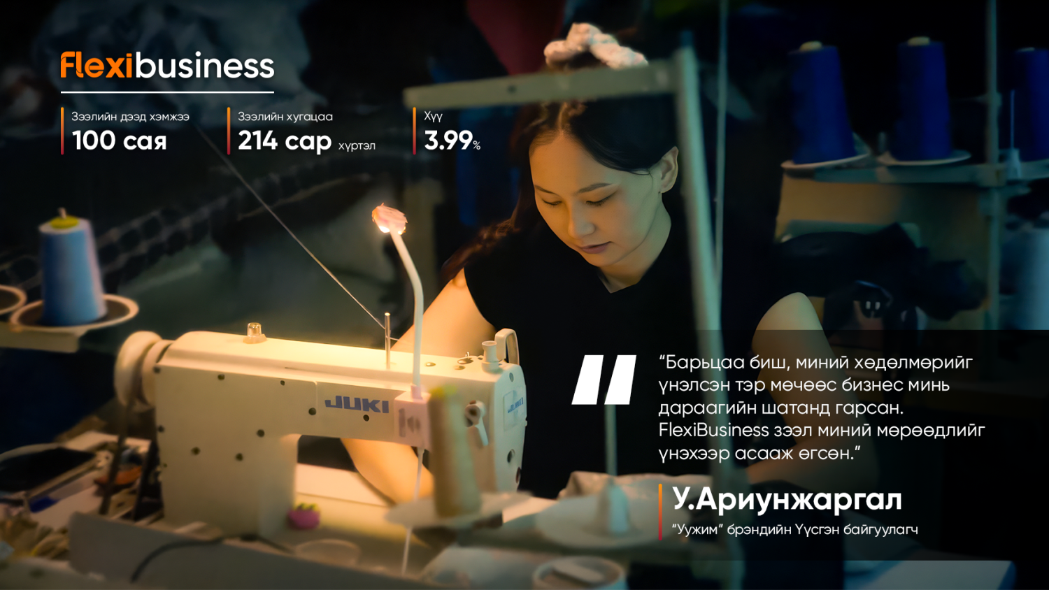Иргэн У.Ариунжаргал нь 2015 онд “Уужим” брэндийг үүсгэн байгуулсан ба Монгол үндэсний дээлийг орчин үеийн загвартай хослуулан урладаг. Бизнес нь тогтвортой ажиллаж байсан ч барьцаа хөрөнгийн шаардлагаас болж зээл авах боломж хязгаарлагддаг байжээ. ЛэндМН-ийн FlexiBusiness зээлийг сонгож, гар утсаараа 5 минутын дотор зээлийн хариугаа авч, шаардлагатай бараа материалаа худалдан авч, ажлын орчноо сайжруулсан байна. Үүний үр дүнд захиалга нь нэмэгдэж, борлуулалт өсжээ. Тэрээр “Мөрөөдлөө бодитоор хэрэгжүүлэхэд FlexiBusiness зээл надад бодит дэмжлэг болсон” хэмээн онцоллоо.