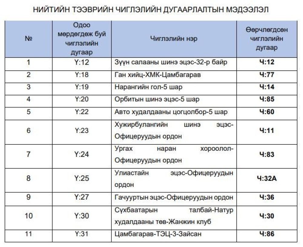 Нийтийн тээврийн 11 чиглэлийн нэршлийн эхний үсгийг өөрчилжээ. Гэхдээ маршрут, цагийн хуваарь, тээврийн хэрэгслийн тоог өөрчлөөгүй байна.