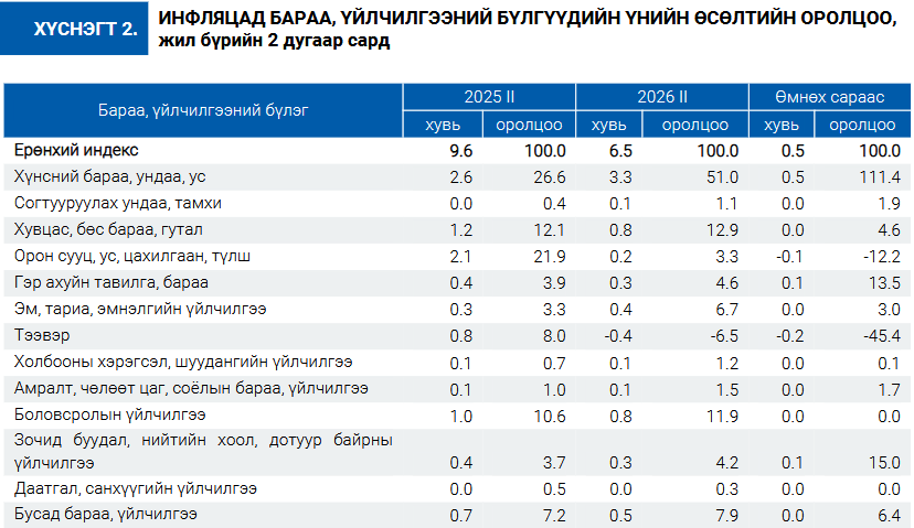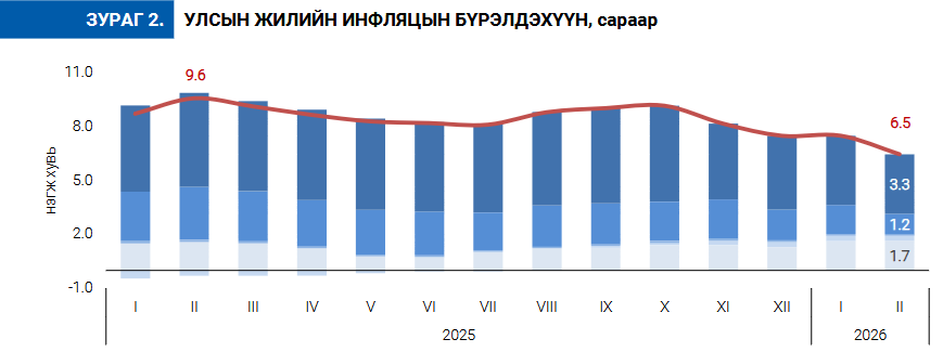 Инфляцын түвшин 2026 оны 2 дугаар сард улсын хэмжээнд 6.5 хувь гарсны 3.3 (51.0%) нэгж хувь нь хүнсний бараа, ундаа, усны бүлэг, 0.8 (12.9%) нэгж хувь нь хувцас, бөс бараа, гутлын бүлгийн үнийн өсөлтөөс голлон шалтгаалжээ