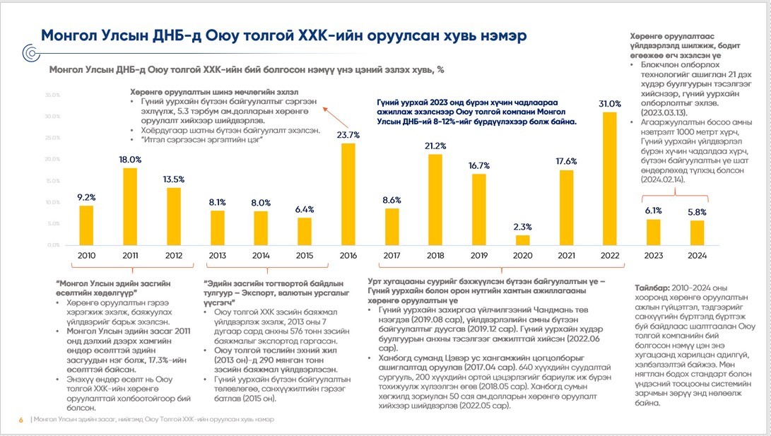 “Оюу толгой”  2010 онд 900 тэрбум төгрөгийн нэмүү үнэ цэнийг бий болгосон бол 2024 онд 4.7 их наяд төгрөгт хүрч, 5.2 дахин өссөн.  “Оюу толгой” үйлдвэрийн оруулсан хувь нэмэр буюу ДНБ-д эзлэх хувийг дараах таван үе шатанд хувааж болохоор байна: