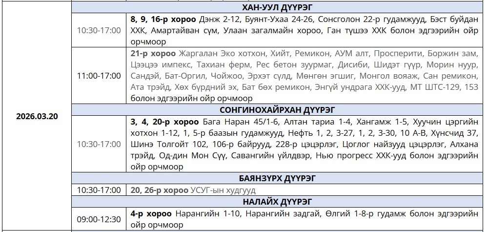 2026.03.20: Цахилгаан хязгаарлах байршлууд