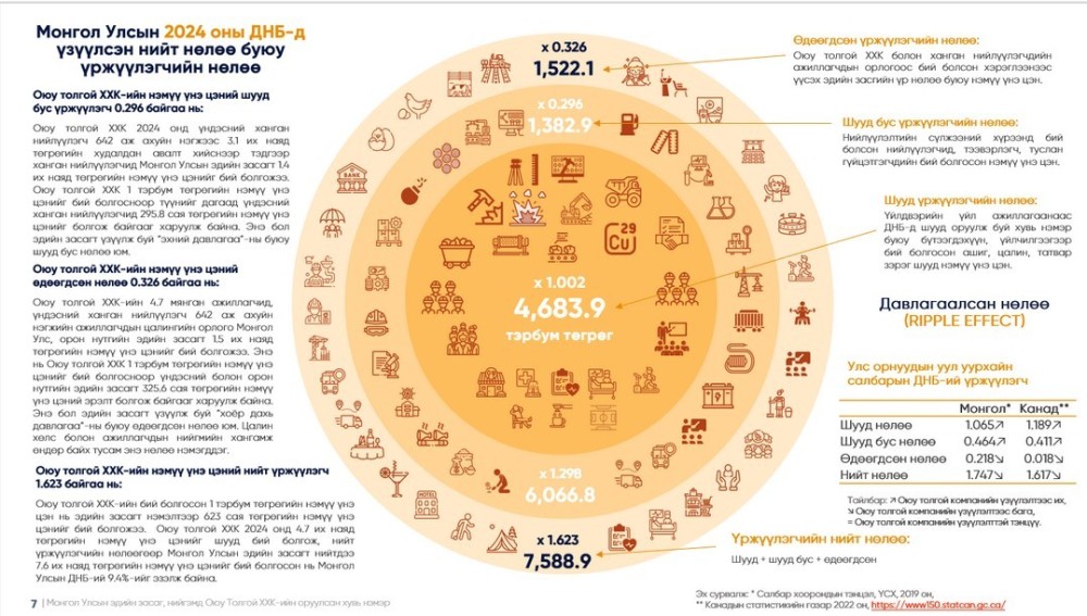 “Оюу толгой” 2024 онд 4.7 их наяд төгрөгийн нэмүү үнэ цэнийг шууд бий болгож, нийт үржүүлэгчийн нөлөөгөөр Монгол Улсын эдийн засагт нийтдээ 7.6 их наяд төгрөгийн нэмүү үнэ цэнийг бий болгосон нь Монгол Улсын ДНБ-ий 9.4 хувийг эзэлжээ.