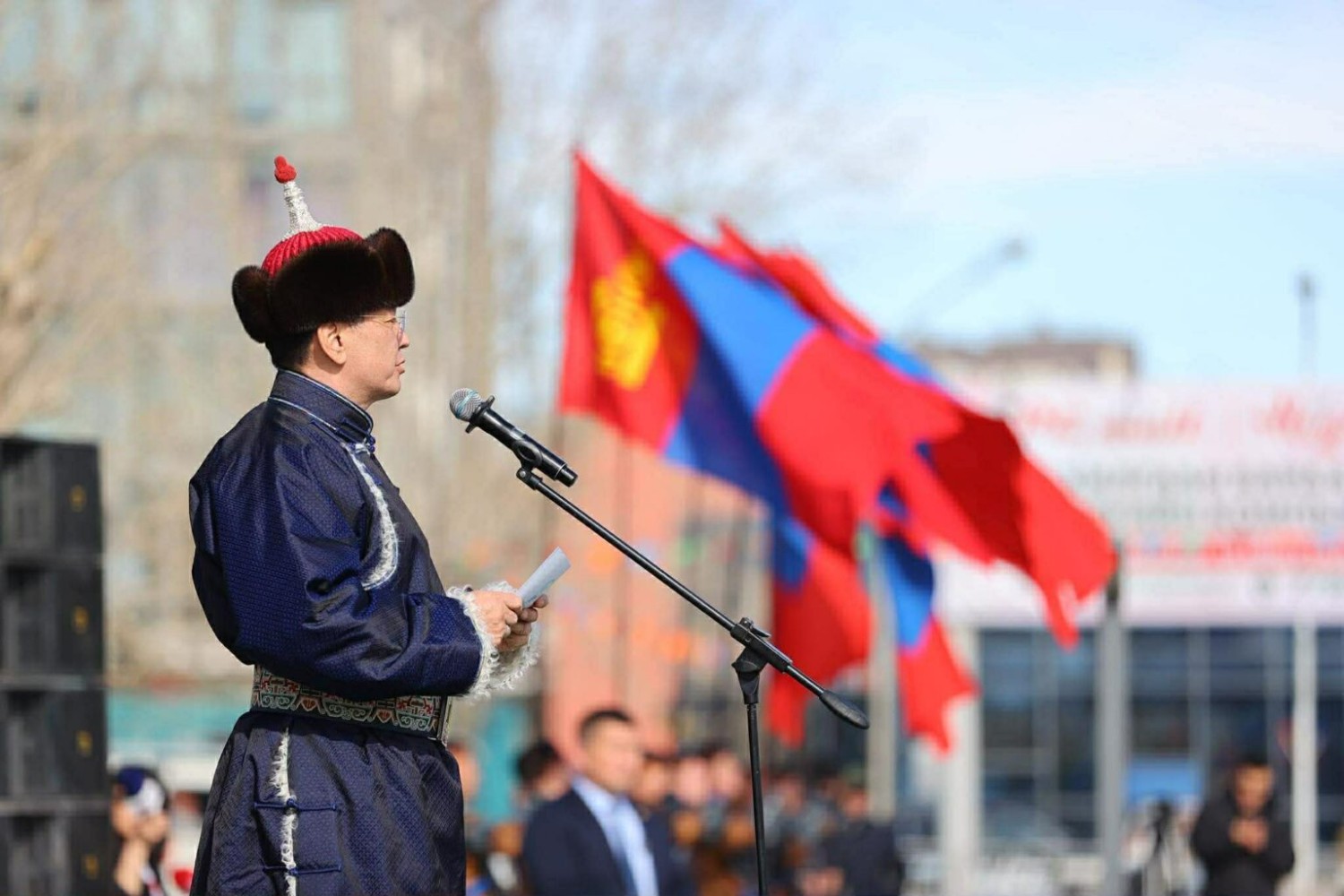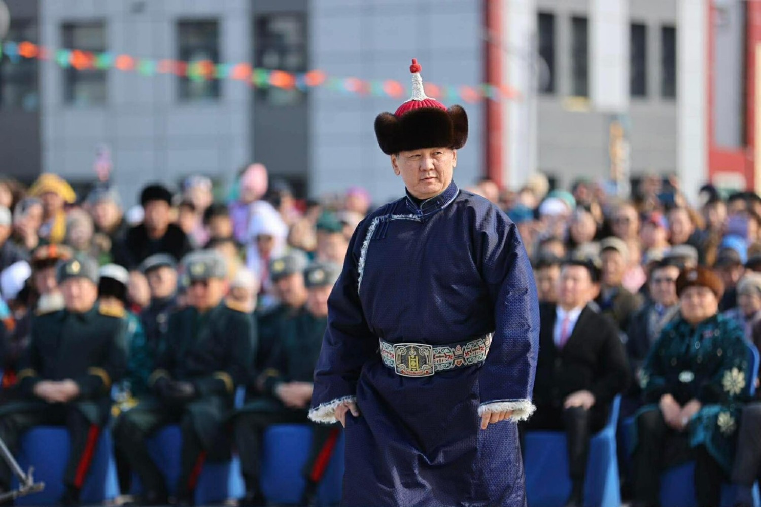 Төв талбайдаа хуран цугласан Та бүхэн Гал морин жилдээ хөх тэнгэрт халин дүүлэх хүрэн бүргэд шигээ цог золбоотой байж, ажил үйлс нь Алтай Таван богд шиг сүндэрлэн байхын өлзийтэй сайхан ерөөлийг өргөн дэвшүүлье. Мөнх тэнгэрийн хүчин дор Монгол Улс мандан бадрах болтугай” гэлээ.