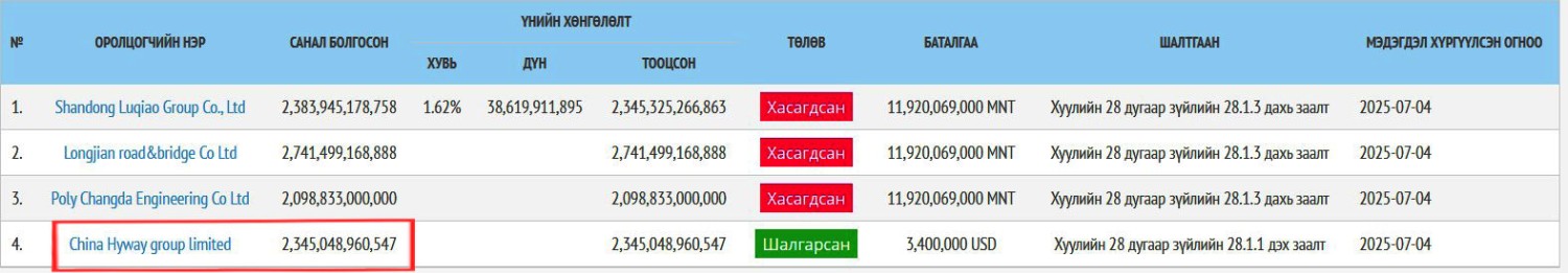 Мөн 2025 оны нэгдүгээр сард анхны тендерийг зарлахад БНХАУ-ын нийт 4 компаниас Хятад Хайвэй групп ХХК шалгарсан байна.
