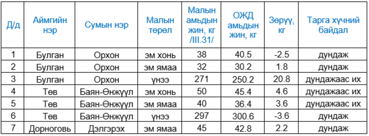 Малын тарга хүчний байдлыг олон жилийн дундажтай харьцуулан доорх хүснэгтэд үзүүлбэл дундаж буюу түүнээс дээш байна.