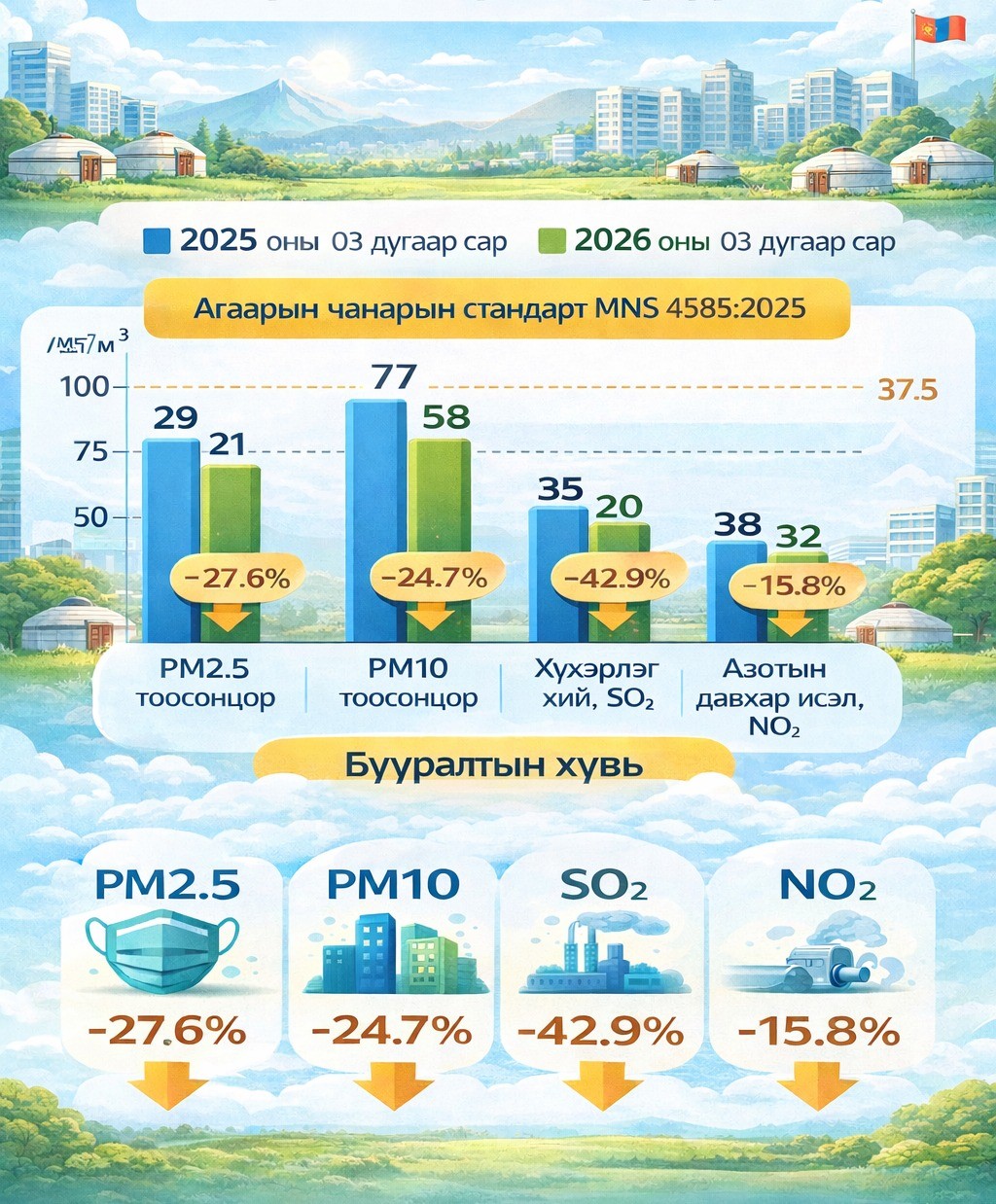 Агаар бохирдуулагч бодисын 2026 оны гуравдугаар сарын дундаж агууламжийг өмнөх оны мөн үе буюу 2025 оны 03 дугаар сарын дундаж агууламжтай харьцуулахад: