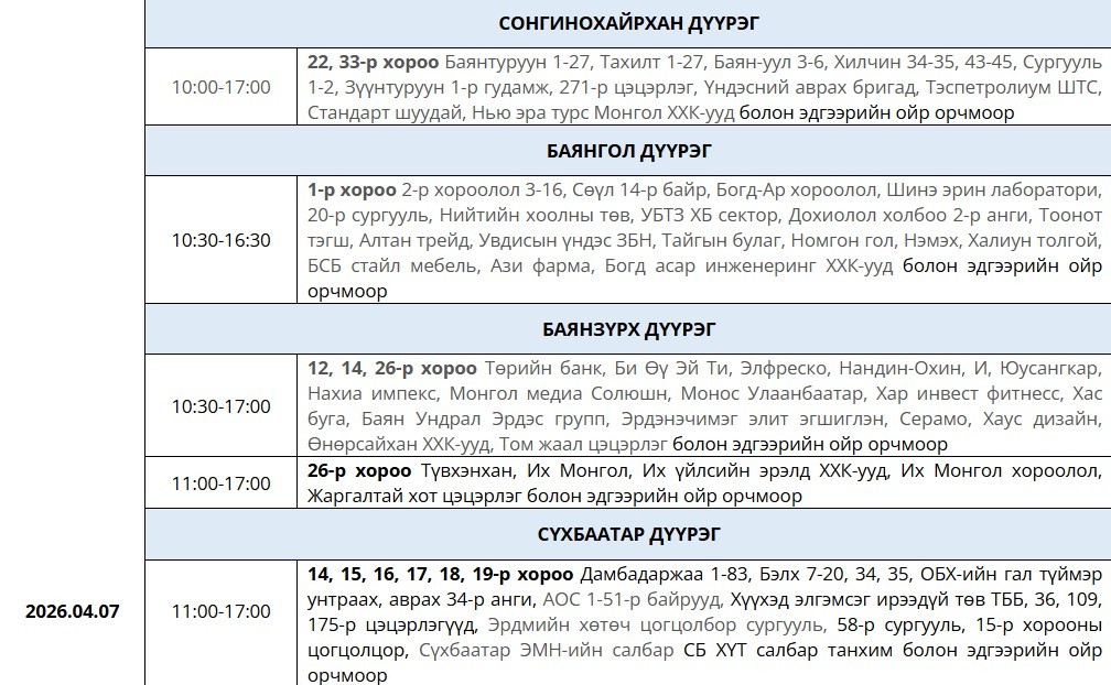 Маргааш 11 байрлалд цахилгаан 10.00-20.00 цаг хүртэл цахилгаан хязгаарлана.