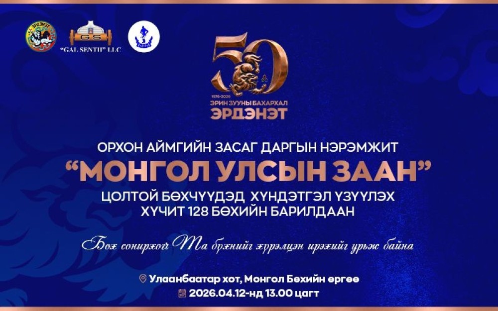 Үндэсний бөхийн спорт сонирхогч Та бүхнийг Эрин зууны бахархал Эрдэнэт хотын 50 жилийн ойн хүрээнд зохион байгуулж буй Орхон аймгийн Засаг даргын нэрэмжит “Монгол Улсын заан” цолтой бөхчүүдэд хүндэтгэл үзүүлэх хүчит 128 бөхийн барилдаанд хүрэлцэн ирэхийг урьж байна.