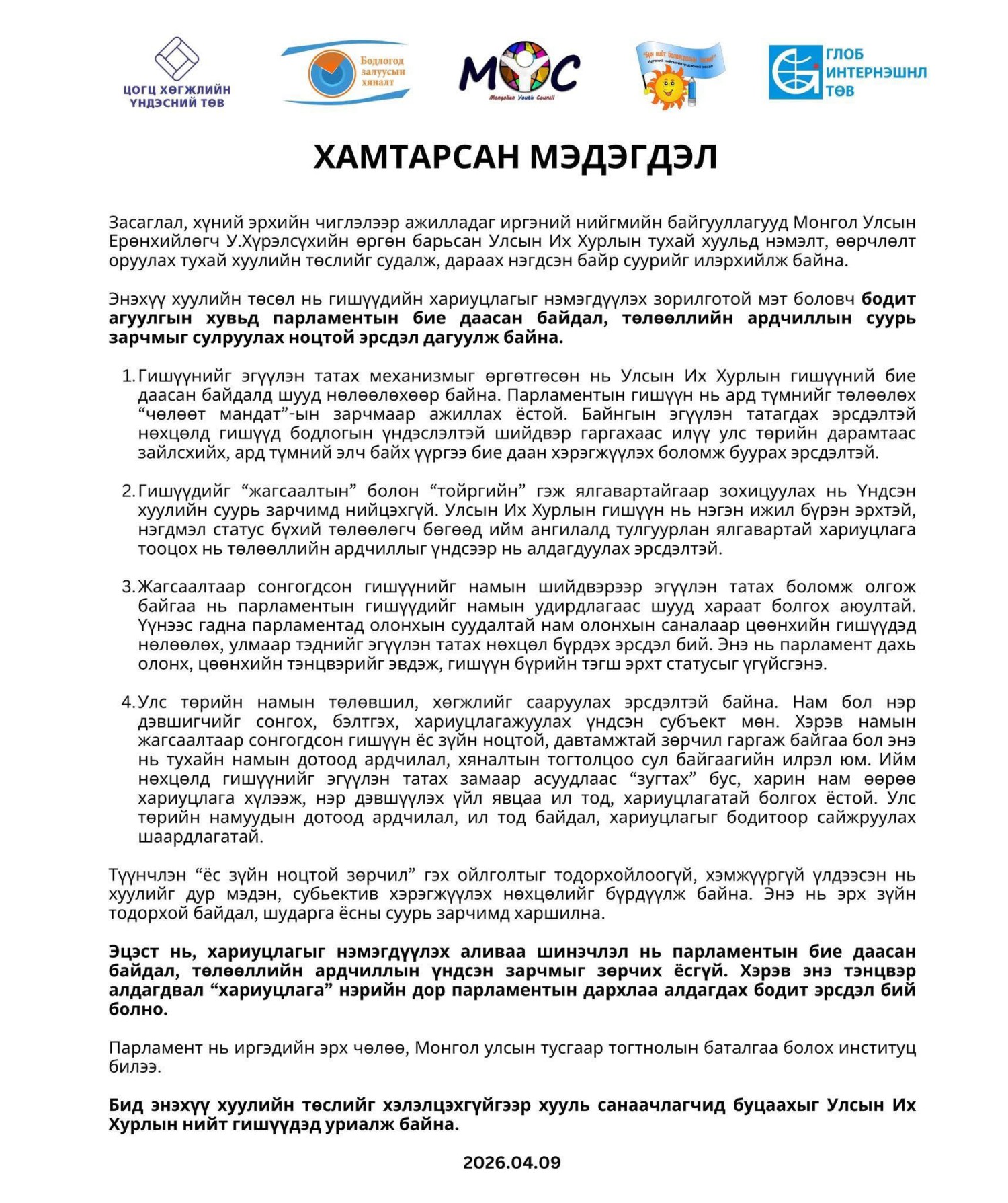 Парламент нь иргэдийн эрх чөлөө, Монгол улсын тусгаар тогтнолын баталгаа болох институц билээ. Бид энэхүү хуулийн төслийг хэлэлцэхгүйгээр хууль санаачлагчид буцаахыг Улсын Их Хурлын нийт гишүүдэд уриалж байна гэжээ.