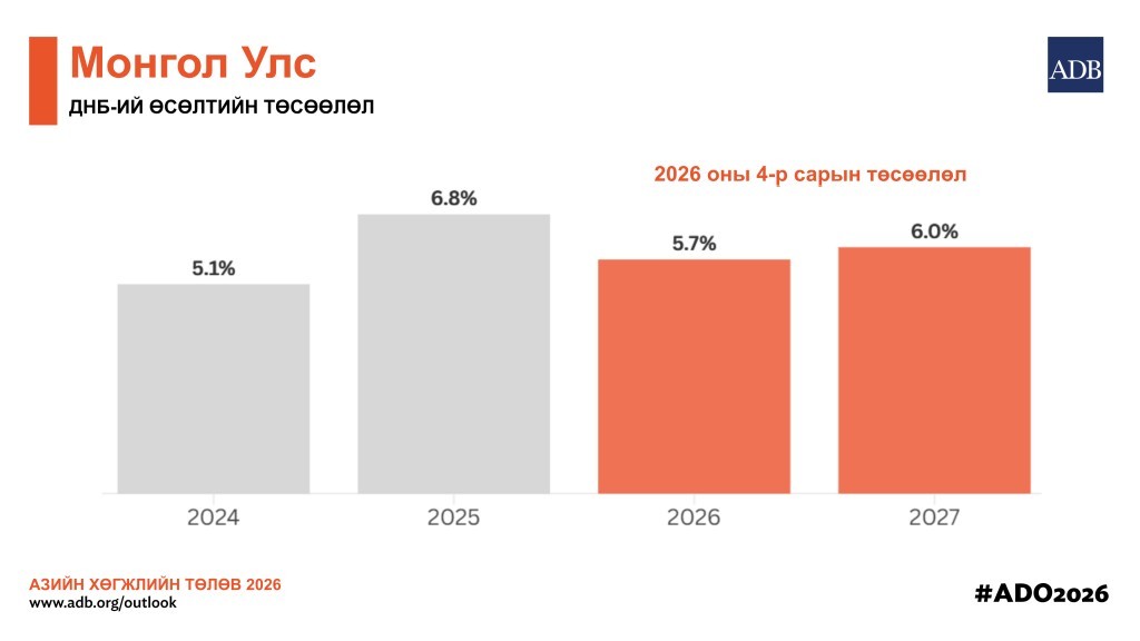 Азийн Хөгжлийн Банк (АХБ)-ны Азийн хөгжлийн төлөв, 2026 оны дөрөвдүгээр сар тайланд Монголын эдийн засаг 2025 оныг сул эхлүүлсэн ч хөдөө аж ахуйн салбар хоёр хүнд өвлийн дараа сэргэж, уул уурхайн өсөлт үргэлжилсний ачаар 6.8 хувиар өссөн гэжээ.
