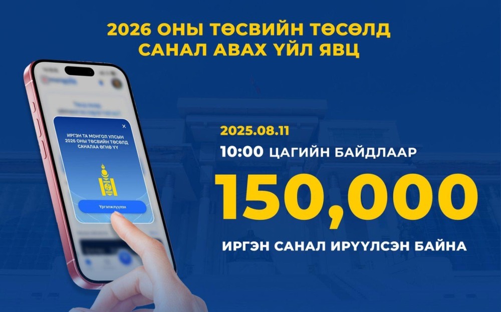 Даваа гарагийн (2025.08.11) 10:00 цагийн байдлаар ирэх оны төсвийн төсөлд E-Mongolia системээр дамжуулж саналаа өгсөн иргэдийн тоо 150.000 хүрчээ.