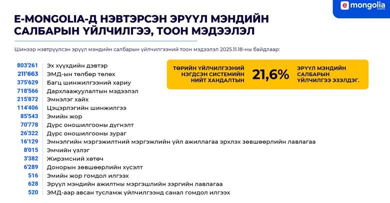 Монгол Улсын төрийн үйлчилгээний нэгдсэн систем болох “E-Mongolia”-д байршсан бүх цахим үйлчилгээнээс 21.6 хувийг зөвхөн эрүүл мэндийн үйлчилгээ эзэлж байна.
