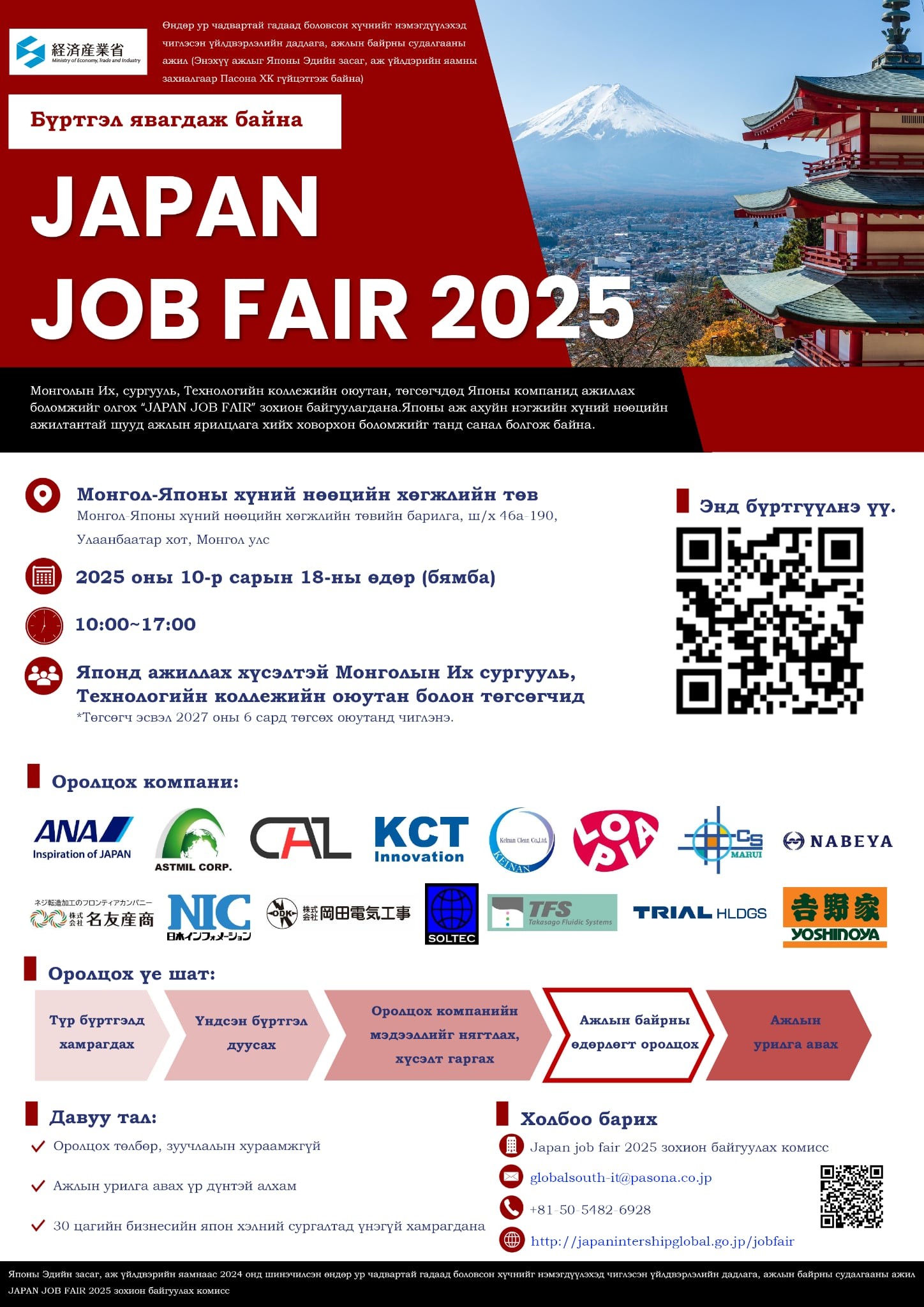 Япон улсад ажиллах хүсэлтэй Монгол улсын Их сургууль болон Технологийн коллежийн оюутан, төгсөгч та бүхнийг Япон улсын Эдийн засаг, аж үйлдвэрийн яамнаас зохион байгуулж байгаа Ажлын байрны өдөрлөг буюу JAPAN JOB FAIR 2025-т урьж байна. Энэхүү өдөрлөгт оролцохын өмнө танилцуулах семинар доорх хуваарийн дагуу 3 удаа болно.