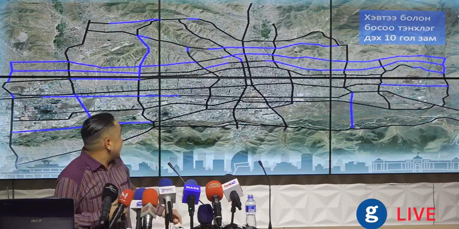 Нийслэлийн замын түгжрэлтэй холбоотойгоор иргэн Э.Тэмүүжин 10 гол замын төлөвлөлтийн талаарх судалгаагаа танилцууллаа. Тэрээр сүүлийн 8-9 жилийн хугацаанд уг судалгааг бие даан хийж гүйцэтгэсэн бөгөөд түгжрэлгүй болгох авто замын төсөл боловсруулжээ.