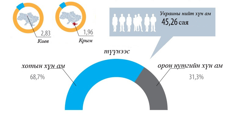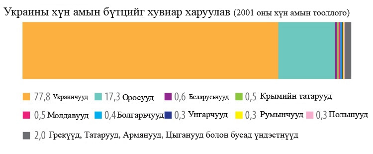 Крымын аралд Украины орос үндэстнүүд хамгийн олноор оршин суудаг. Хүн амын 58 хувь нь орос, 24 хувь украин, 12 хувь татар. Харин тэдний 75 хувь нь орос хэлийг эх хэлээ гэж үздэг бол ердөө 10 хувь нь украин хэлийг эх хэлээ гэж үздэг. Түүнчлэн тэдний 97 хувь нь оросоор ярьдаг болохыг харуулсан судалгааны дүн ч байдаг аж.