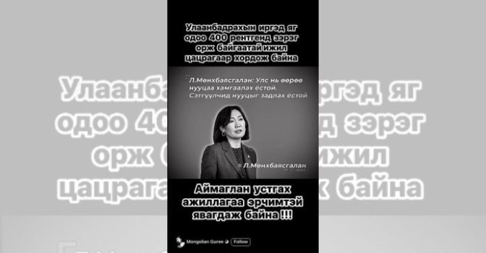 2025 оны дөрөвдүгээр сарын 25-ны өдөр Mongolian Guree нэртэй хаягаас “Улаанбадрахын иргэд яг одоо 400 рентгэнд зэрэг орж байгаатай ижил цацрагаар хордож байна, аймаглан устгах ажиллагаа эрчимтэй явагдаж байна” гэсэн бичлэг нийтэлжээ. Энэхүү текстийг УИХ-ын гишүүн Л.Мөнхбаясгалангийн зурагтай, “Улс өөрөө нууцаа хамгаалах ёстой, сэтгүүлчид нууц задлах ёстой” гэсэн бичигтэй зургийн дээр оруулсан байна.