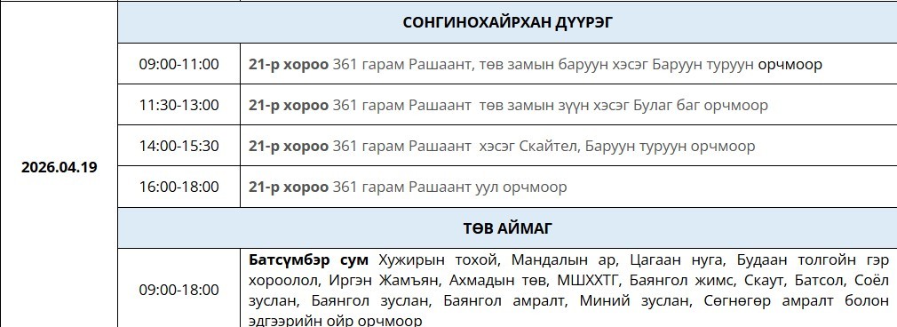 Маргааш буюу энэ сарын 19-ний ням гарагт нийслэлийн Сонгинохайрхан дүүрэг болон Төв аймагт цахилгаан хязгаарлана. Ирэх долоо хоногийн цахилгаан хязгаарлах хуваарийг эндээс харна уу.