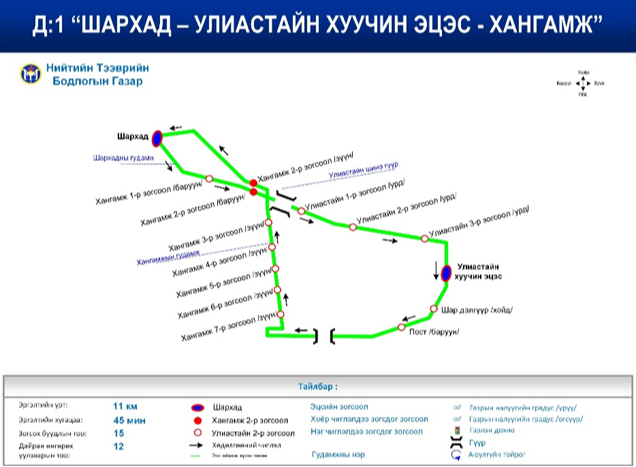 Түүнчлэн Шархадны эцсийн зогсоолоос Улиастайн хуучин эцэс хүртэлх 3.9 км хатуу хучилттай зам тавигдаж, нийтийн тээврийн хэрэгсэл зорчих нөхцөл бүрдсэн. Иймд Баянзүрх дүүргийн 35 дугаар хороонд нийтийн тээврийн үйлчилгээг хүргэх зорилгоор Д:1 “Шархад–Улиастайн хуучин эцэс–Хангамж” чиглэлийн замналд шинээр 4 байршилд нийтийн тээврийн хэрэгслийн дундын зогсоолыг төлөвлөж, нийтийн тээврийн хэрэгслийг явуулахаар болжээ.