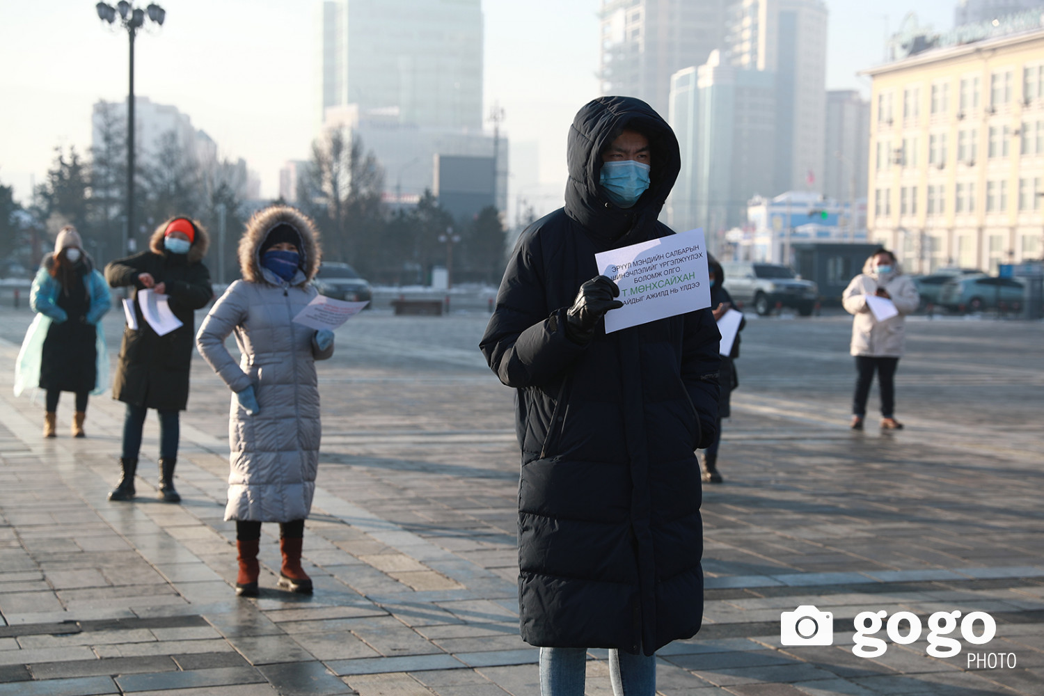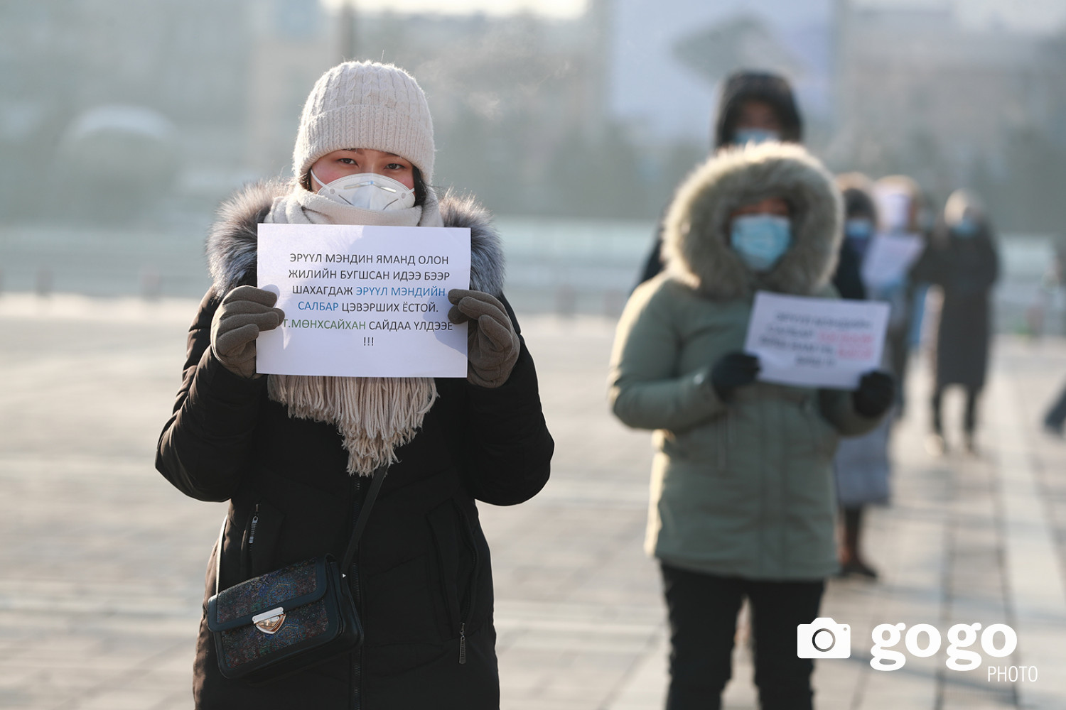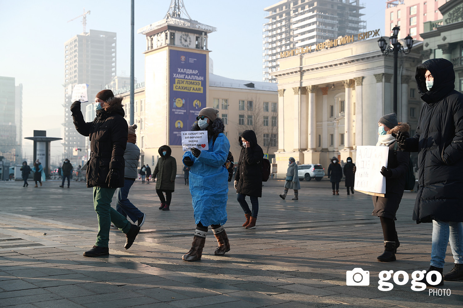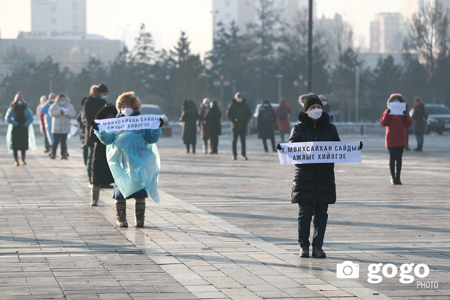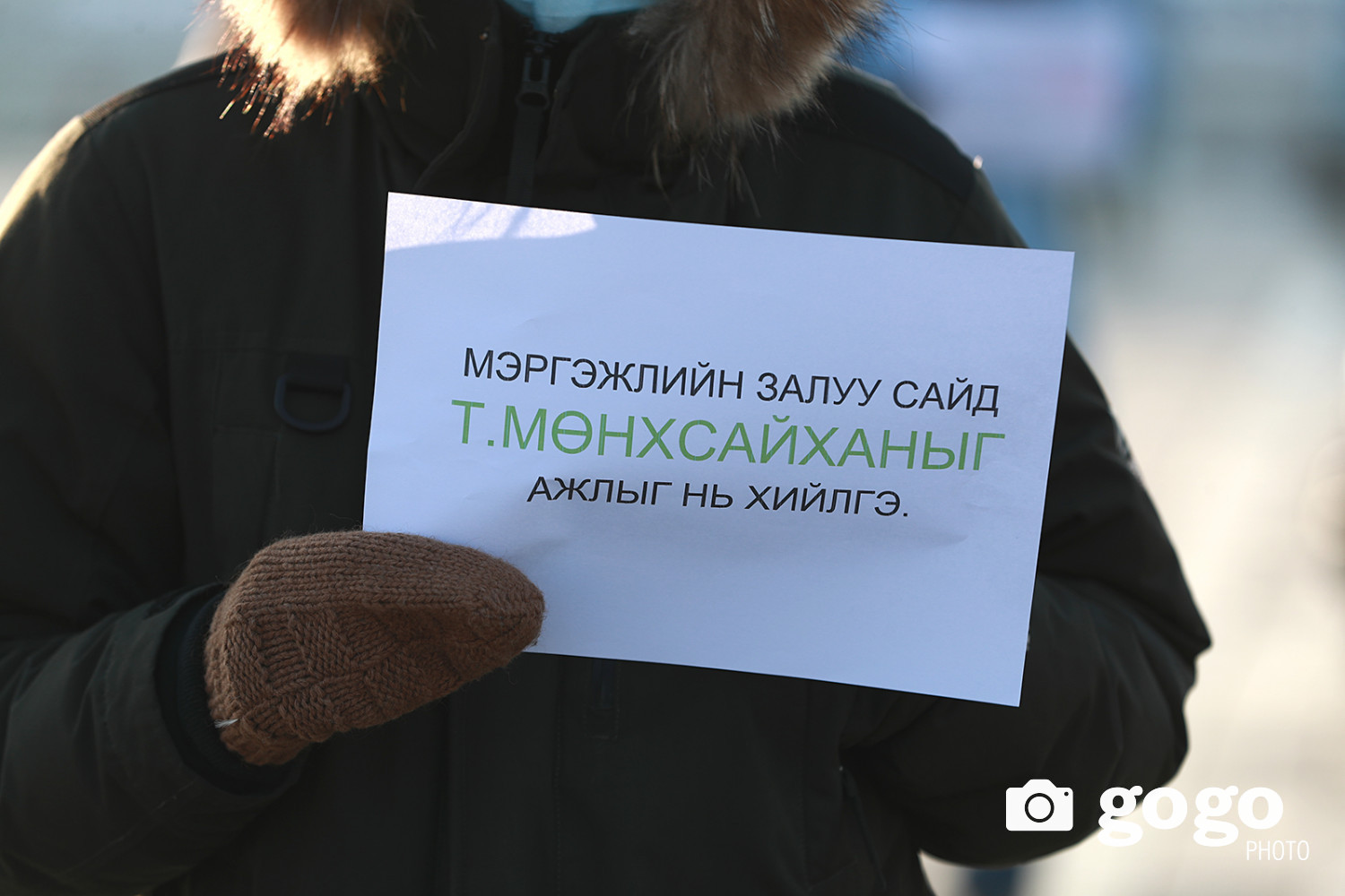 Нэг удаагийн халат нөмөрсөн хүмүүс талбайн баруун, зүүн хэсгийн зам дагуу зогсож, "Т.Мөнхсайхан сайдын ажлыг хийлгэе", "Тэр чадна", "Бид шаардаж байна" зэрэг бичгийг барьсан байна.