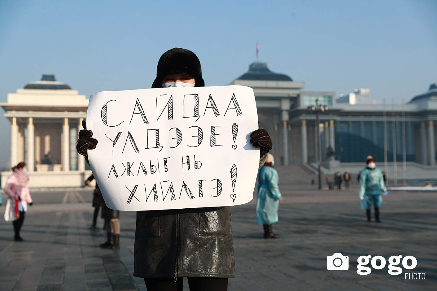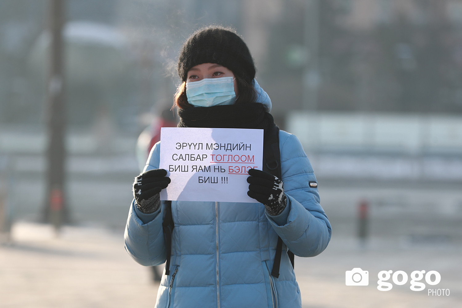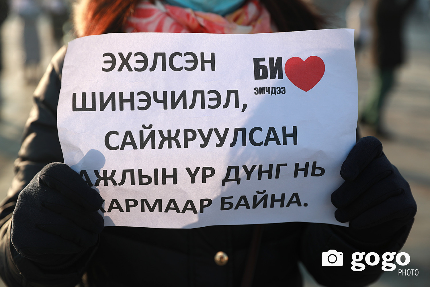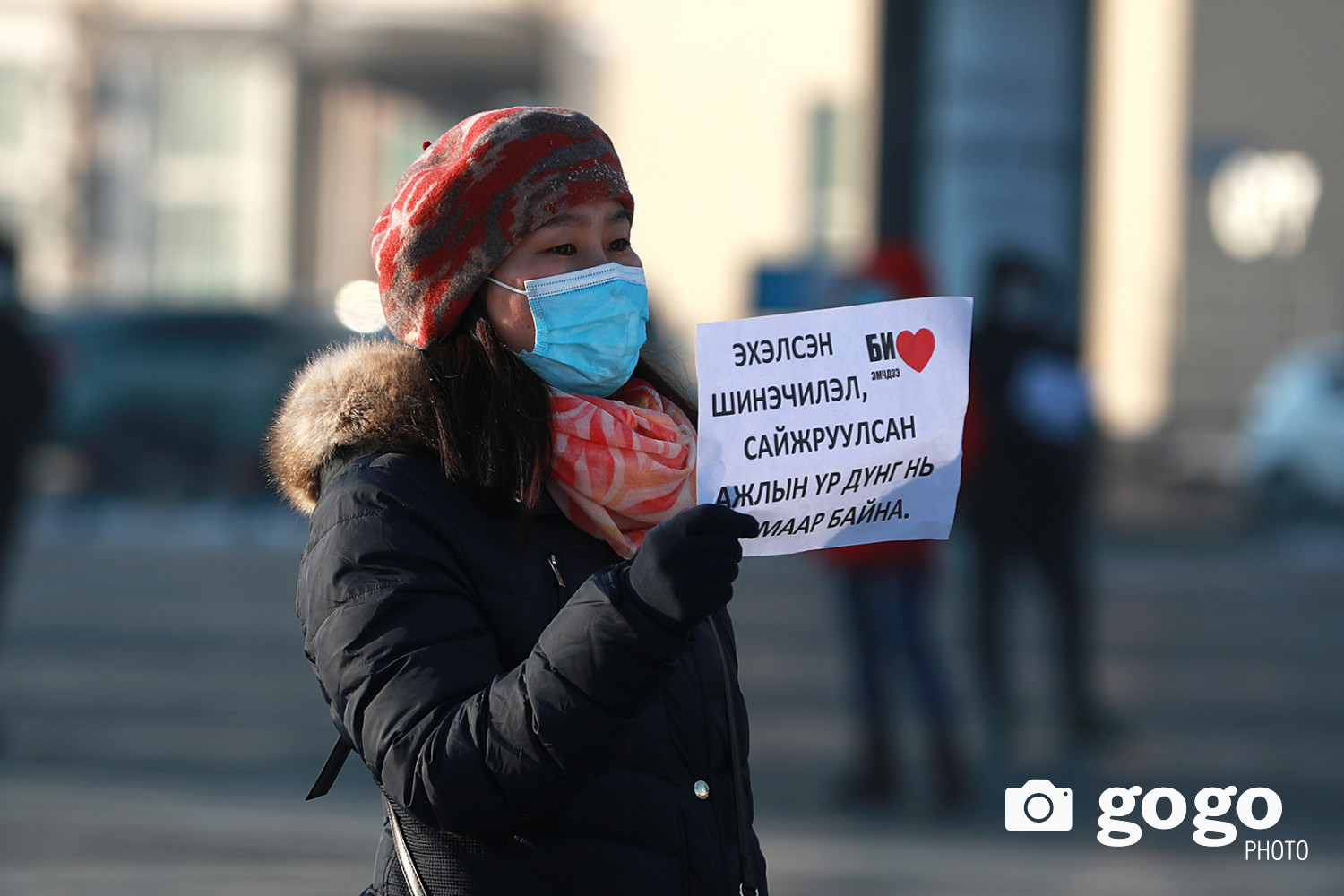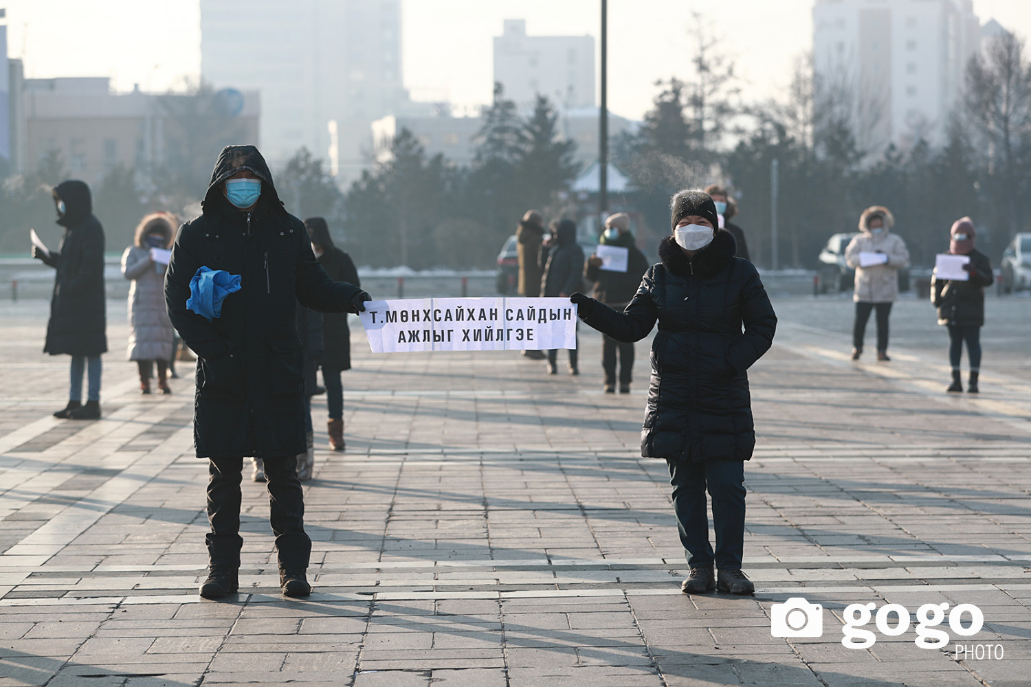 Нэг удаагийн халат нөмөрсөн хүмүүс талбайн баруун, зүүн хэсгийн зам дагуу зогсож, "Т.Мөнхсайхан сайдын ажлыг хийлгэе", "Тэр чадна", "Бид шаардаж байна" зэрэг бичгийг барьсан байна.