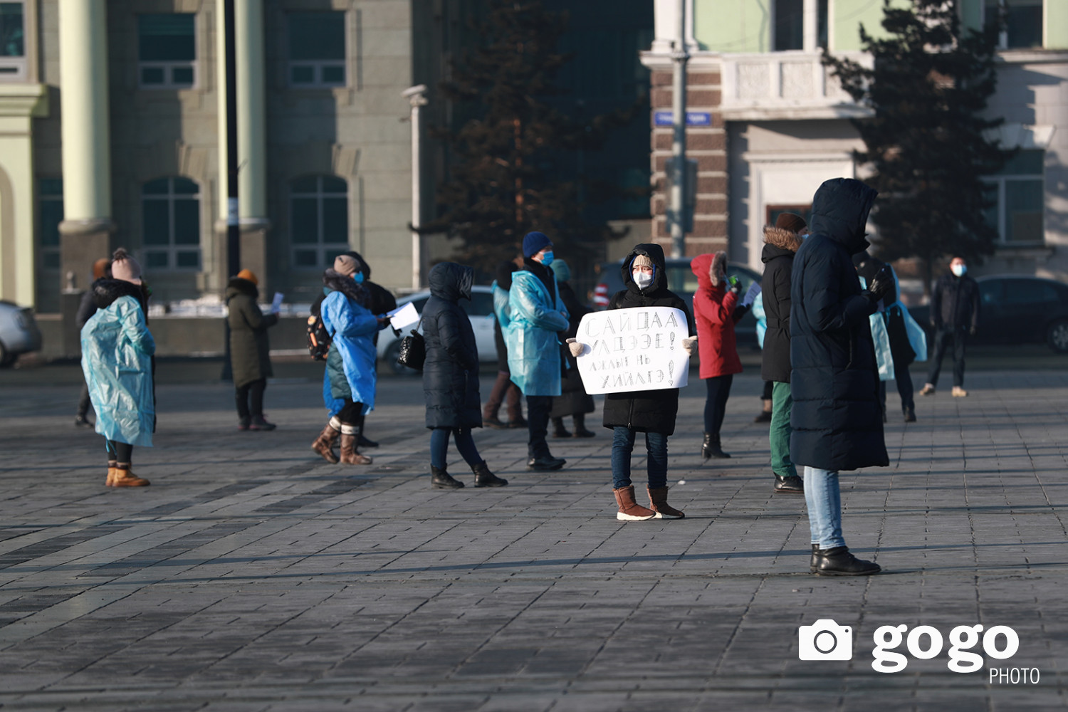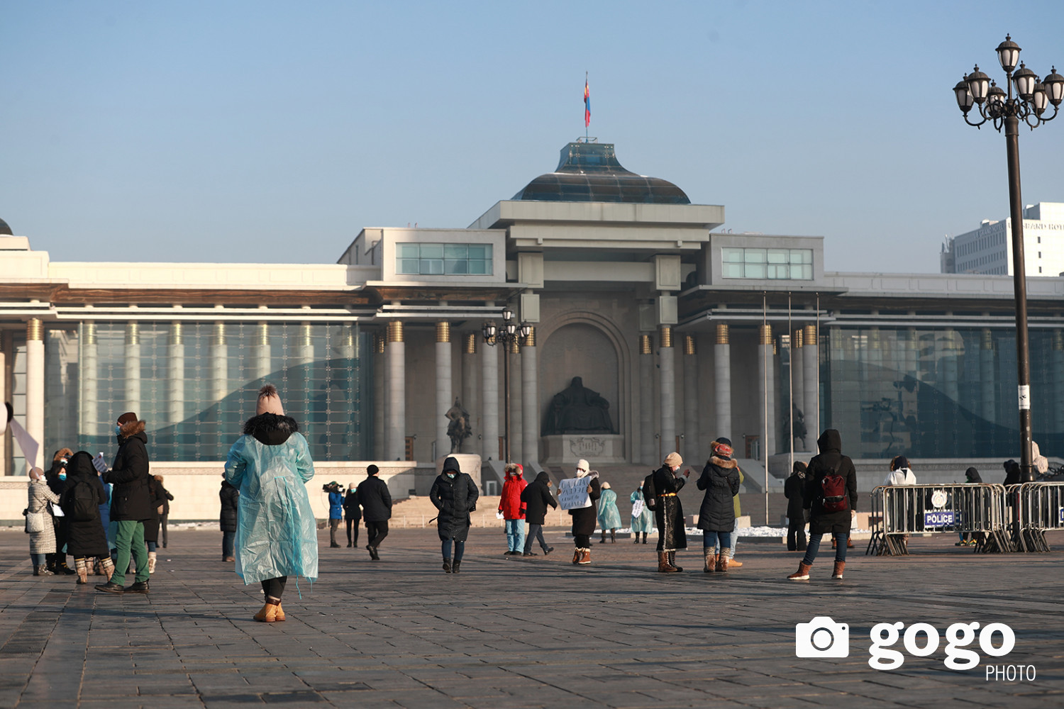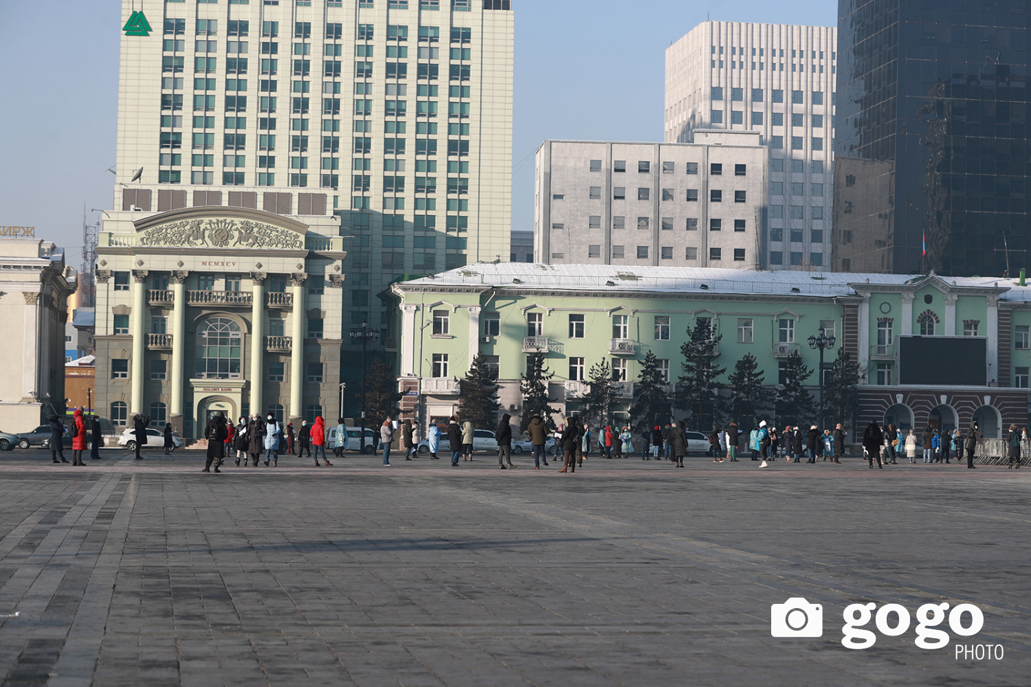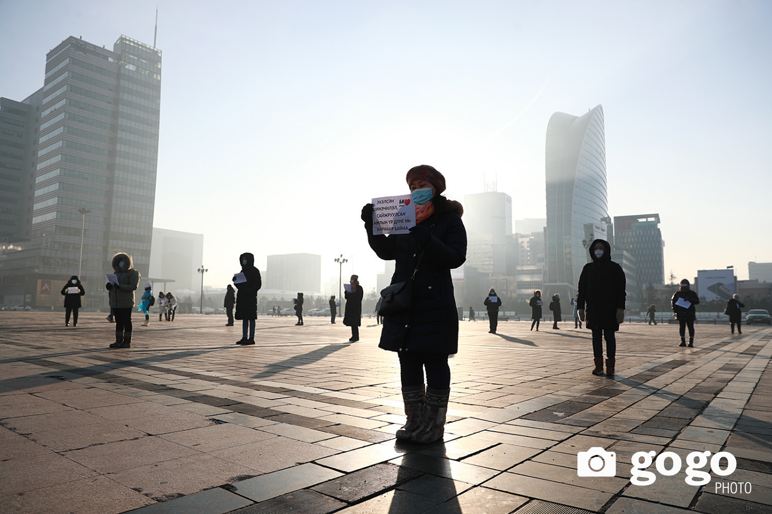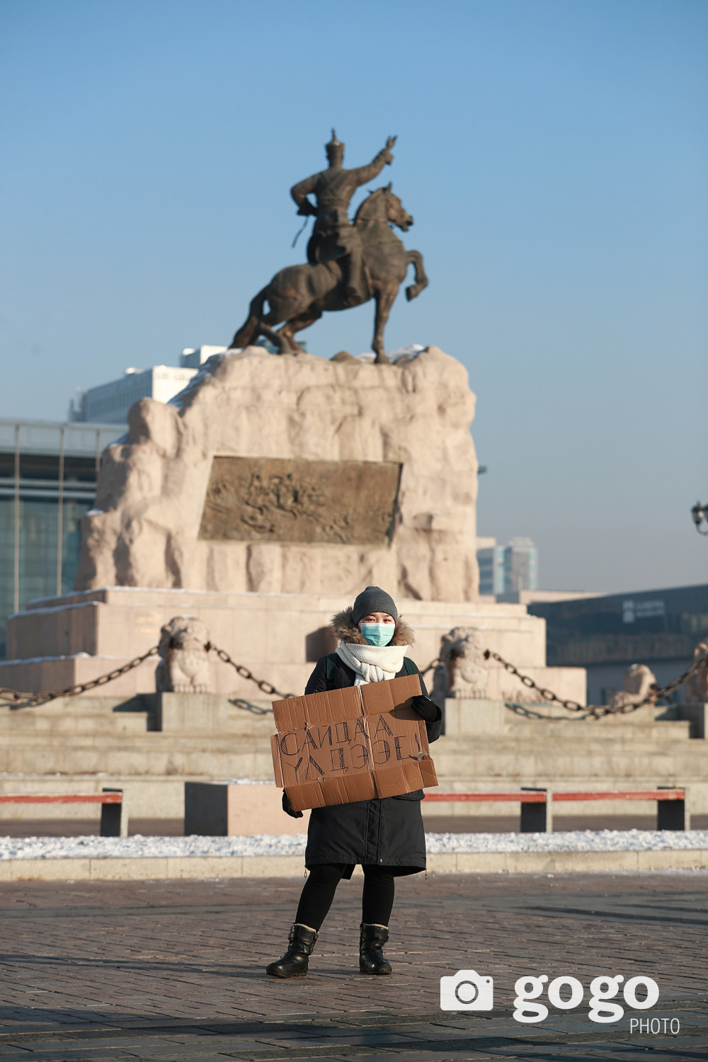 Нэг удаагийн халат нөмөрсөн хүмүүс талбайн баруун, зүүн хэсгийн зам дагуу зогсож, "Т.Мөнхсайхан сайдын ажлыг хийлгэе", "Тэр чадна", "Бид шаардаж байна" зэрэг бичгийг барьсан байна.