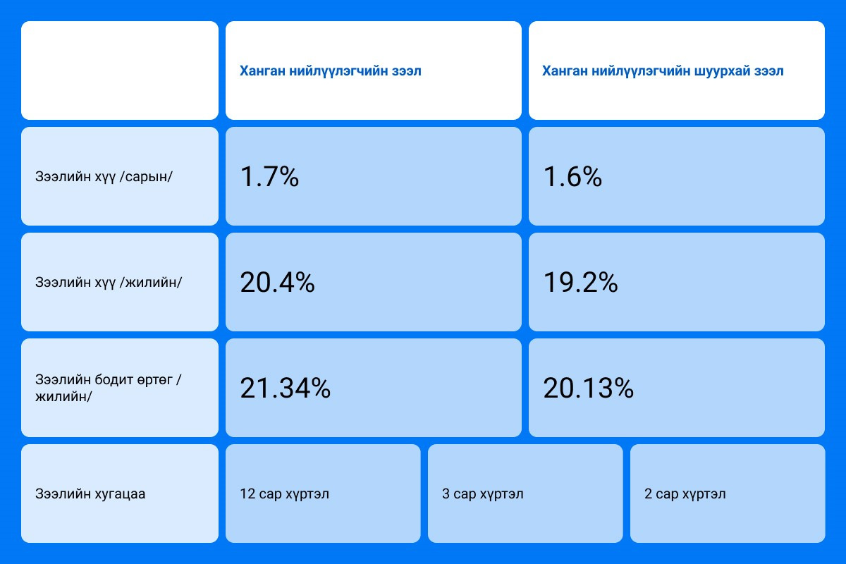 Түүнчлэн үл хөдлөх хөрөнгө болон автомашин барьцаалсан сарын 1.7 хувийн хүүтэй 200 сая хүртлэх төгрөгийн зээл авах боломжтой. Үүний тулд