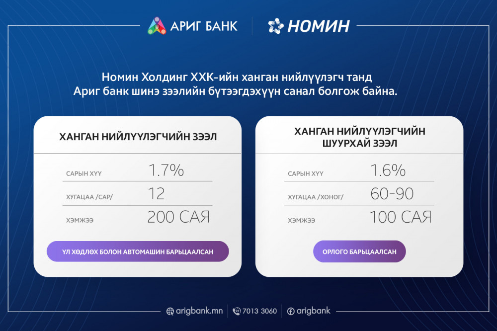 Ариг банкнаас бизнес эрхлэгчдийг дэмжих үүднээс Номин холдинг компанийн ханган нийлүүлэгчдэд уян хатан нөхцөлтэй сарын 1.6 хувийн хүүтэй, 60-90 хоногийн хугацаатай зээлийн шинэ үйлчилгээ гаргажээ. Номингийн ханган нийлүүлэгчдээс үл хөдлөх хөрөнгийн барьцаа шаардахгүйгээр 100 сая хүртэлх төгрөгийн зээл олгож буй юм.