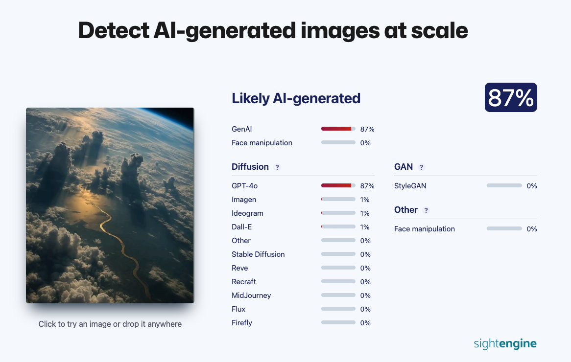 Бид тус зургийг хиймэл оюун ухааны тусламжтай үүсгэсэн зураг эсэхийг шалгадаг sightengine хэрэглүүр ашиглан шалгахад хиймэл оюун ухаанаар үүссэн байх магадлал нь 87%, мөн GPT-4o моделийг ашигласан гэсэн үр дүн гарсан.