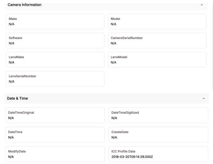 ExifData буюу зургийн файлуудаас мэдээлэл унших, задлахад зориулсан хэрэглүүр ашиглан тус зургийг шалгахад ямар нэгэн мэдээлэл байхгүй, бүгд N/A (Not Available) гэсэн хариу гарсан. Энэ нь хиймэл оюун ухаанаар үүсгэсэн зураг, эсвэл интернэтээс татаж авсан үед EXIF мэдээлэл устсан зураг байх боломжтой.
