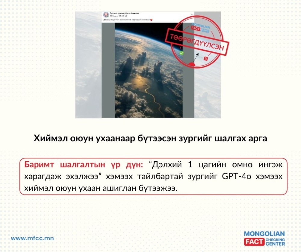 Баримт шалгалтын үр дүн - “Дэлхий 1 цагийн өмнө ингэж харагдаж эхэлжээ” хэмээх тайлбартай зургийг GPT-4o хэмээх хиймэл оюун ухаан ашиглан бүтээжээ.