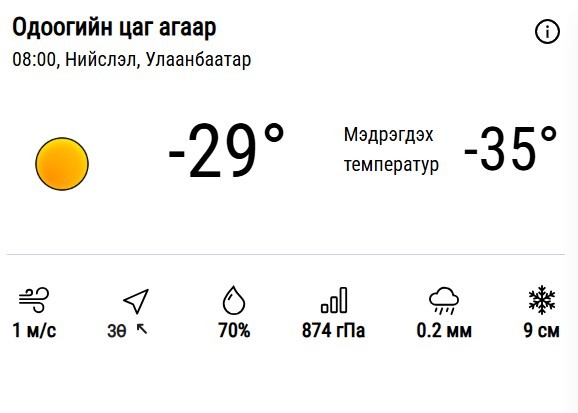 БАГАНУУР ОРЧМООР: Багавтар үүлтэй, цас орохгүй. Салхи баруун хойноос секундэд 3-8 метр. -25...-27 градус хүйтэн байна.