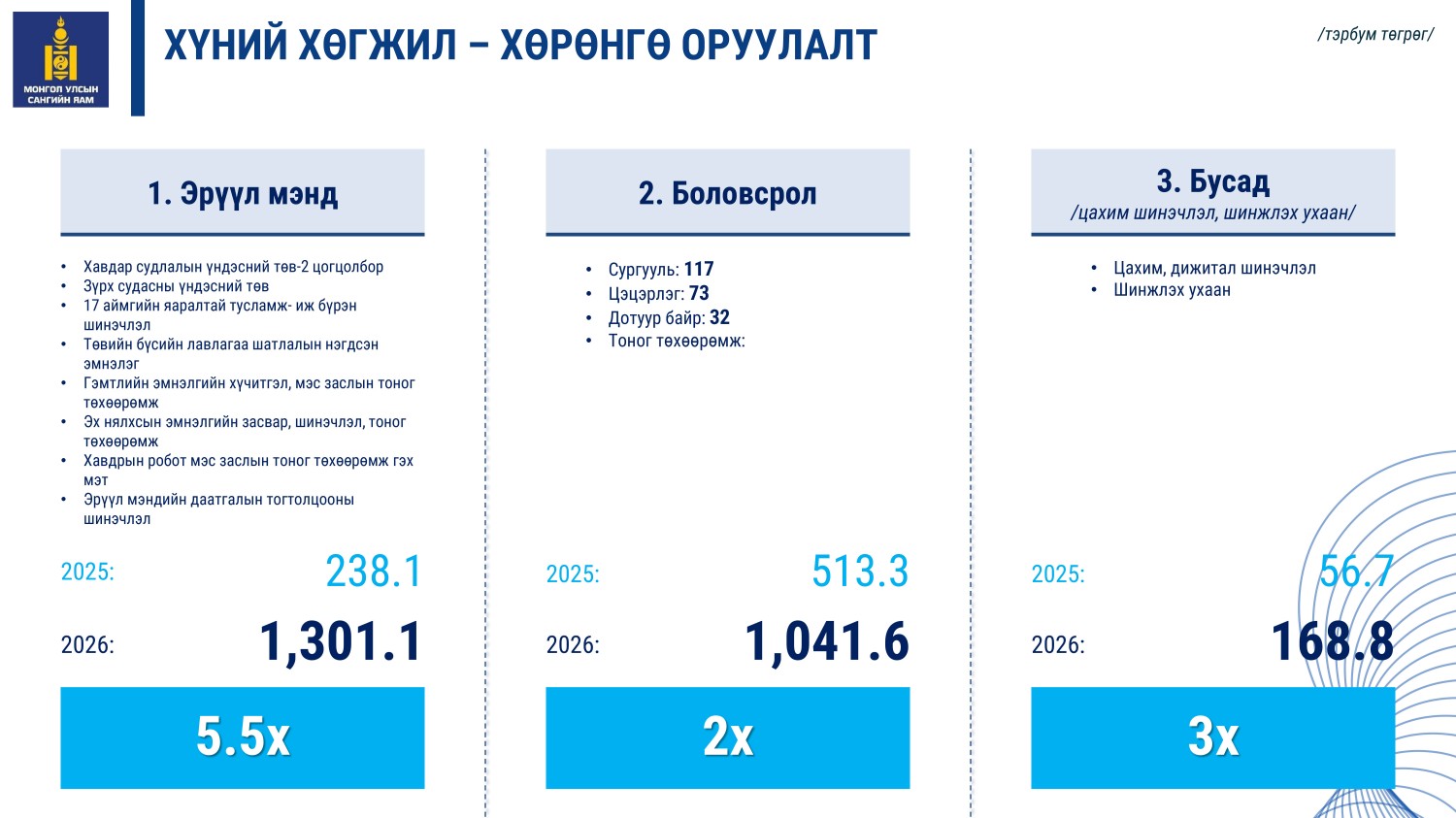 Засгийн газар ирэх онд эрүүл мэндийн төсвийг хамгийн их буюу 5.5 дахин өсгөжээ. Ингэснээр 1.3 их наяд төгрөгийг энэ салбарт зарцуулж, дараах ажлуудыг хийнэ.