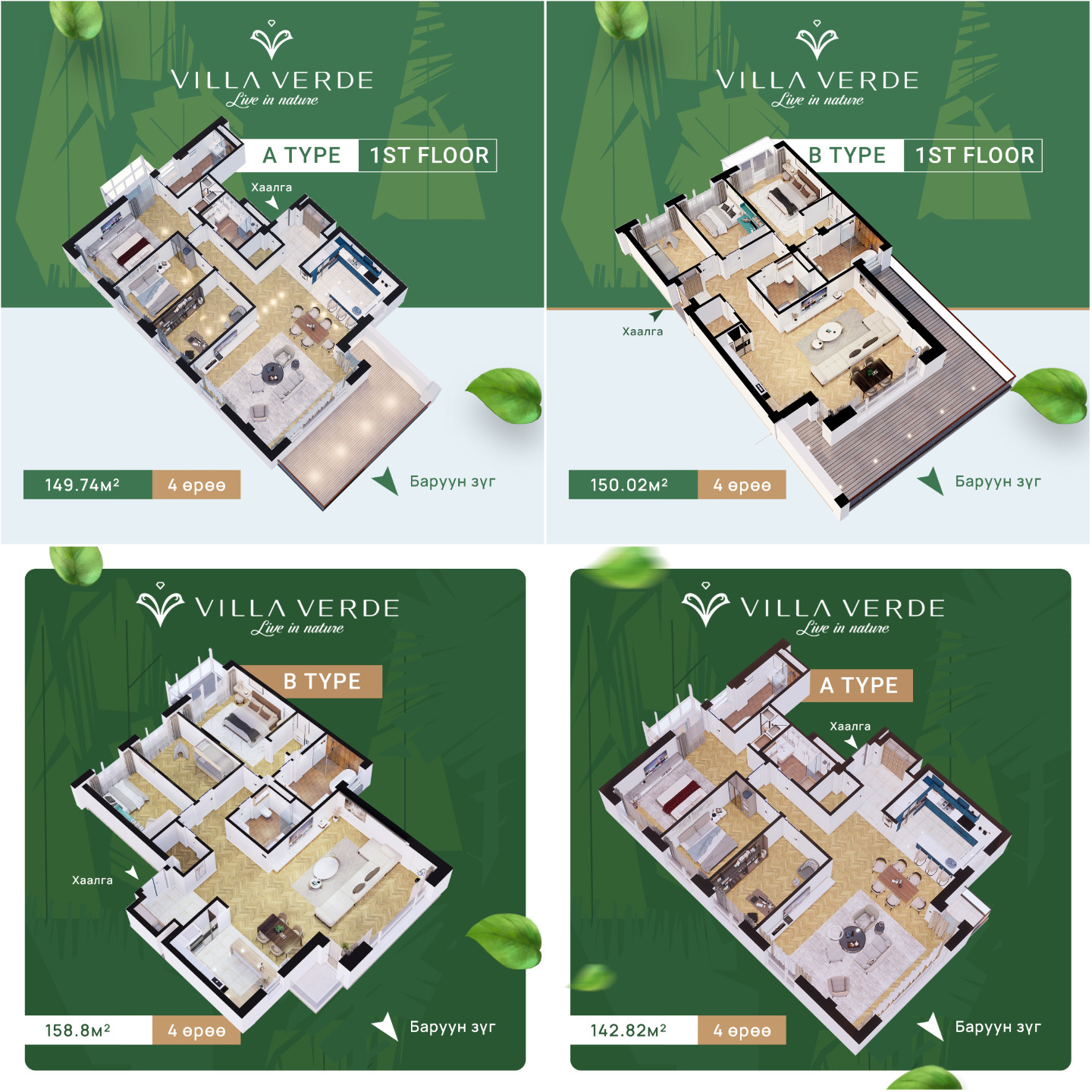 Манай Villa Verde төсөл нь давхартаа 2 айлтай бөгөөд төгс шийдэл бүхий ашиггүй талбайгүй 4өрөө 142.82 м.кв - 158.8 м.кв бүхий дөрвөн сонголттой байрыг танд санал болгож байна.