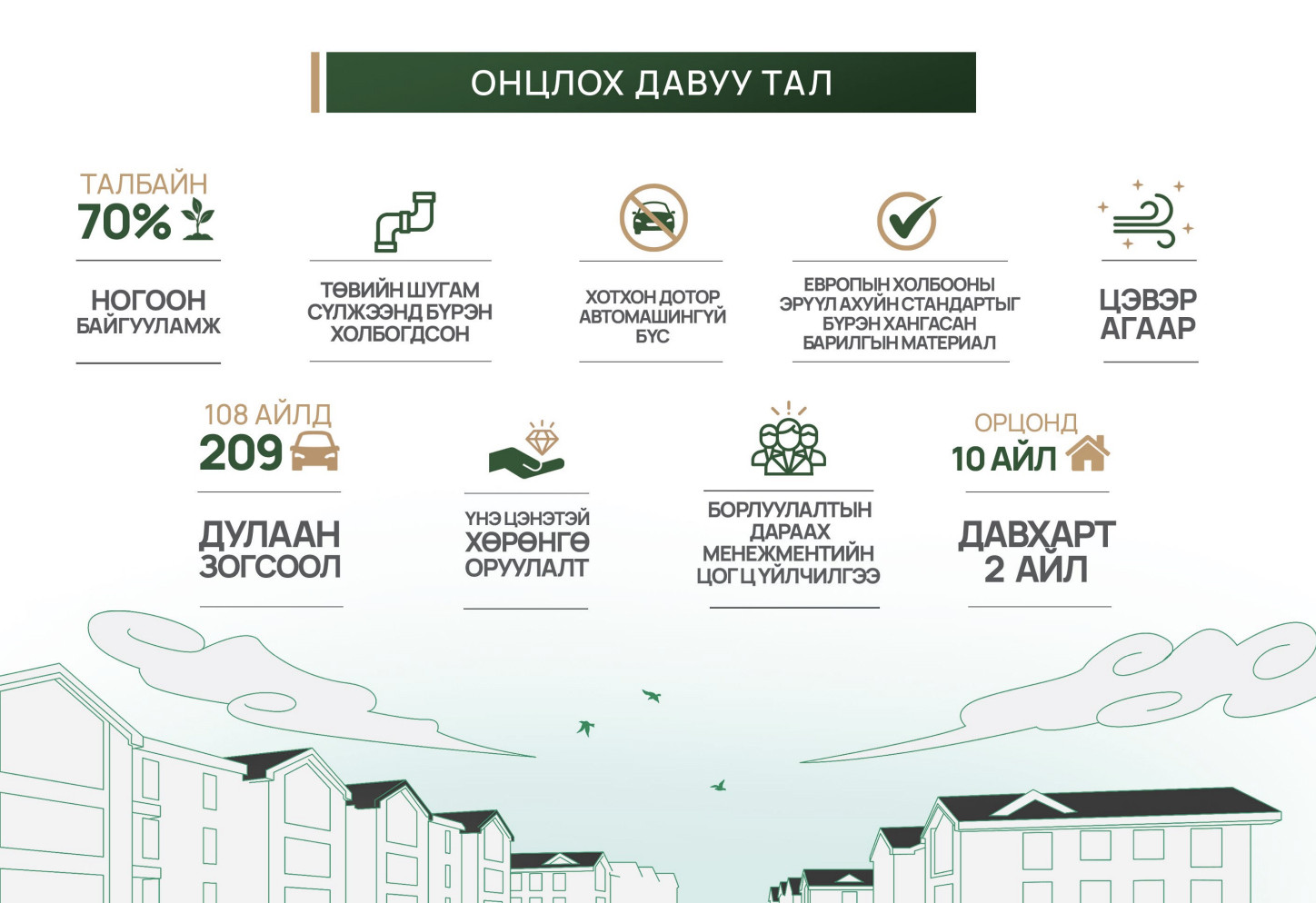 Төслийн нийт талбайн 70%-д ногоон байгууламжтай 1000 орчим шинэс, навчит төрлийн мод, ургамлыг суулгаж ЭКО орчныг бүрдүүлсэн одоо болон ирээдүйд ч үнэ цэнээ үл алдах өндөр зэрэглэлийн хотхоныг танд болон таны гэр бүлд санал болгож байна.